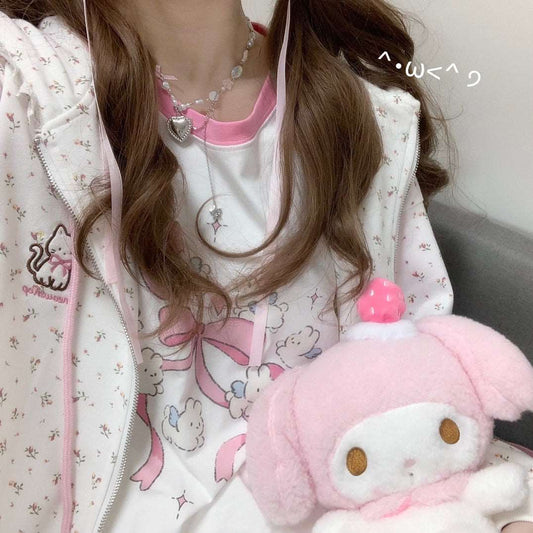 Cute Kitty Cat Print White Pink Yellow Y2K Oversize Hoodie