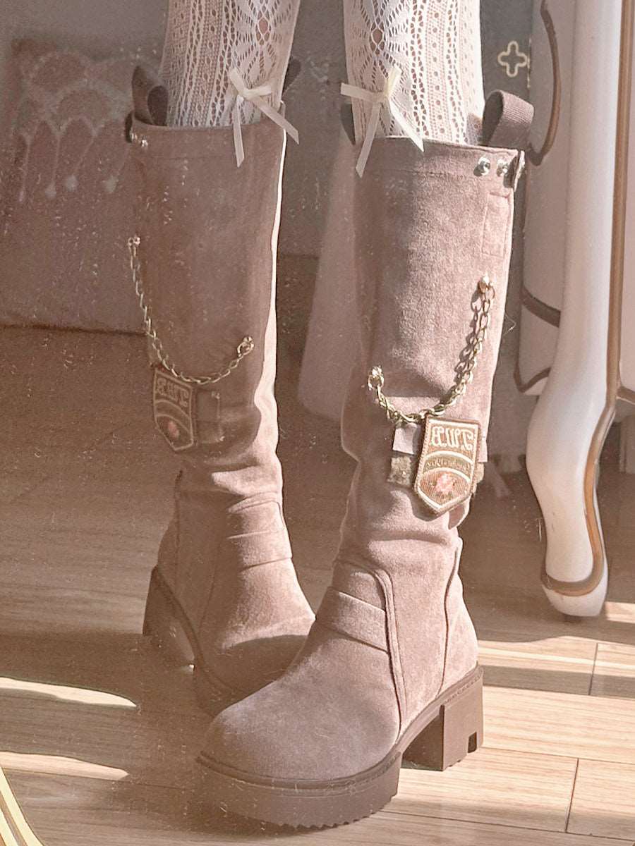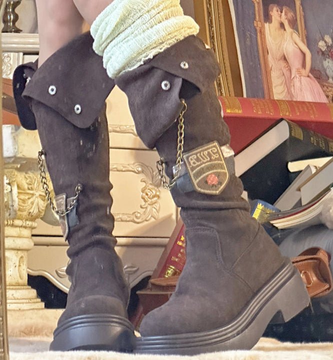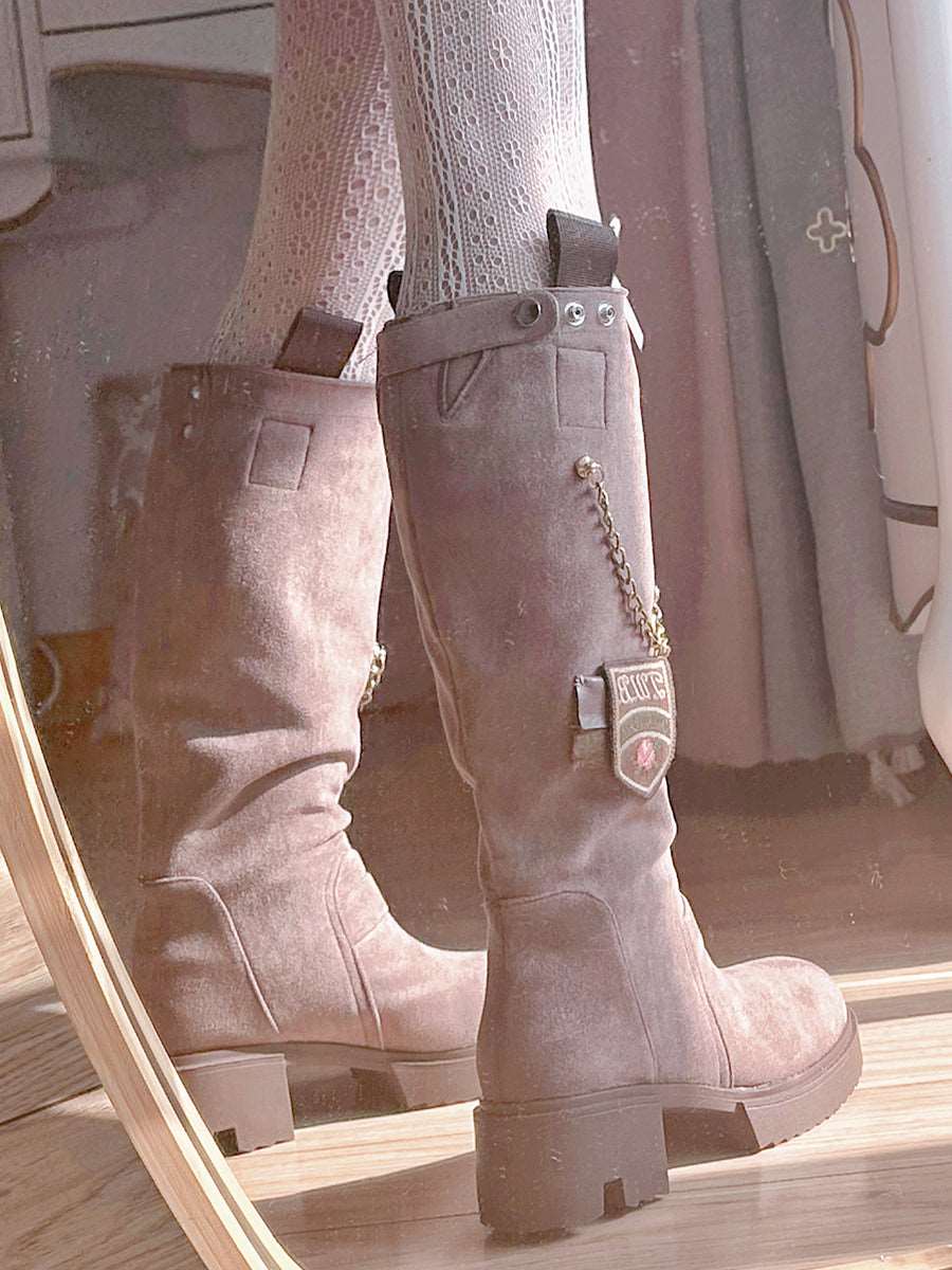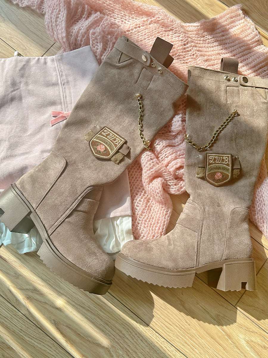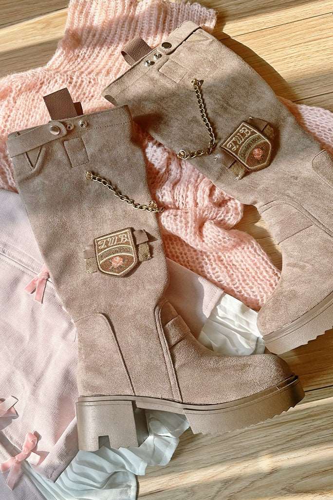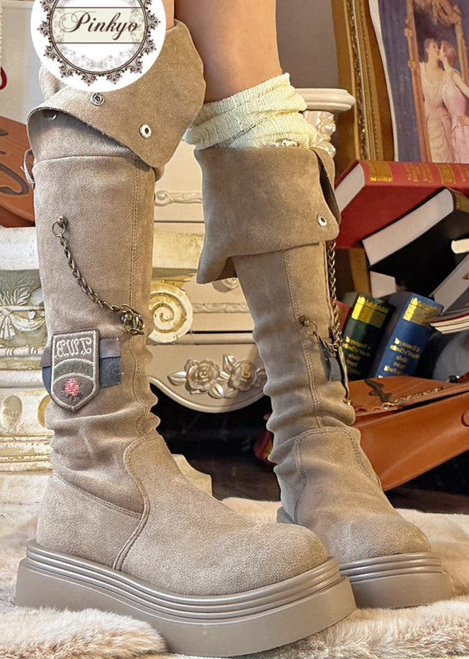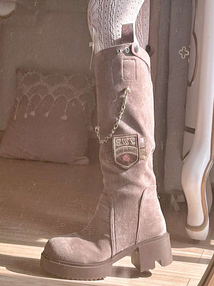 Pinky Brown Autumn Winter Academia Leather Knight Boots