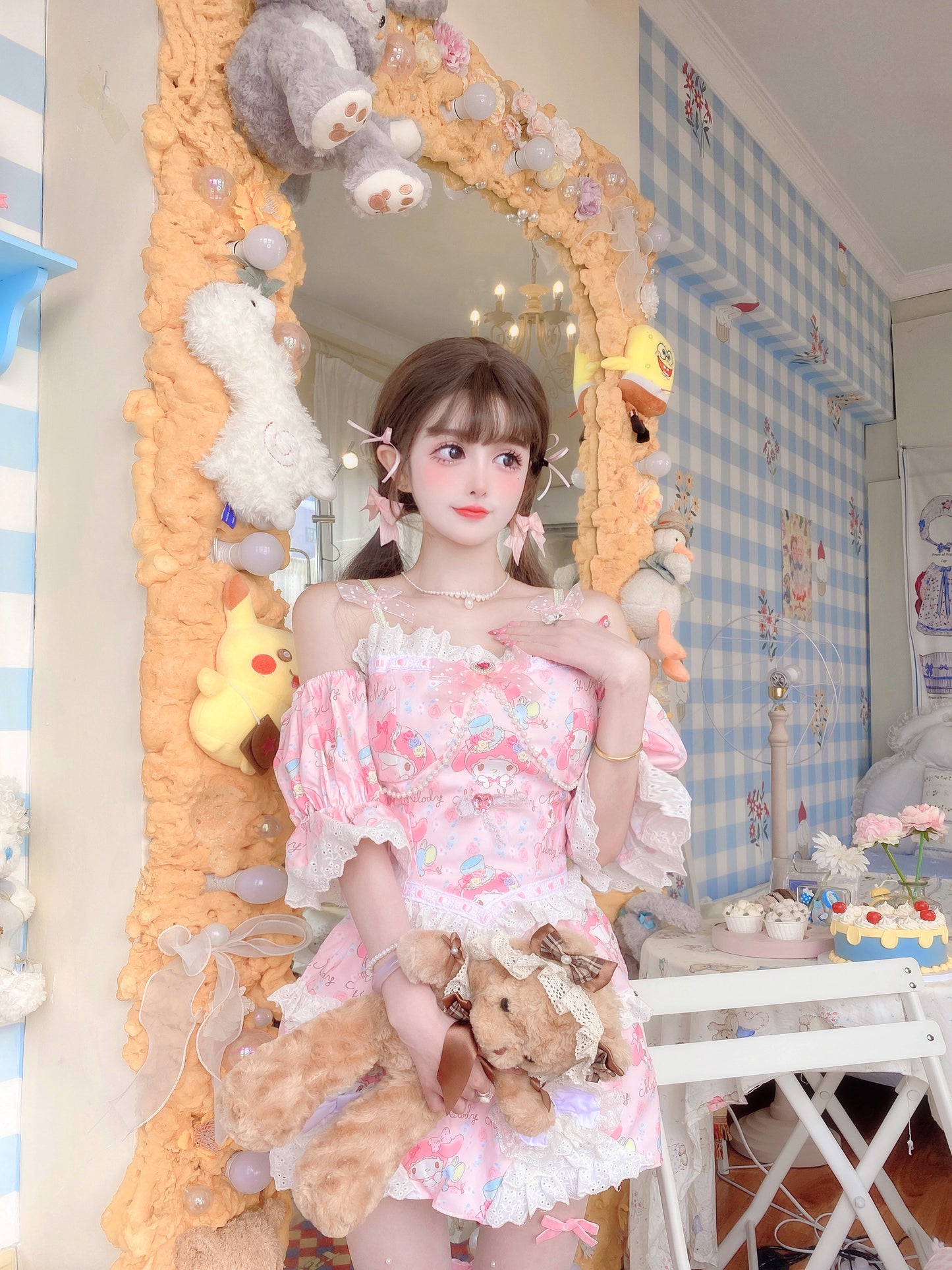 Candy Fairy Pink Melody Cartoon Camisole Puff Sleeve Top & Skirt Pajamas Two Piece Set