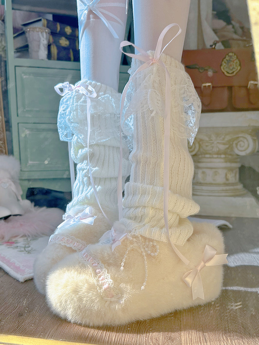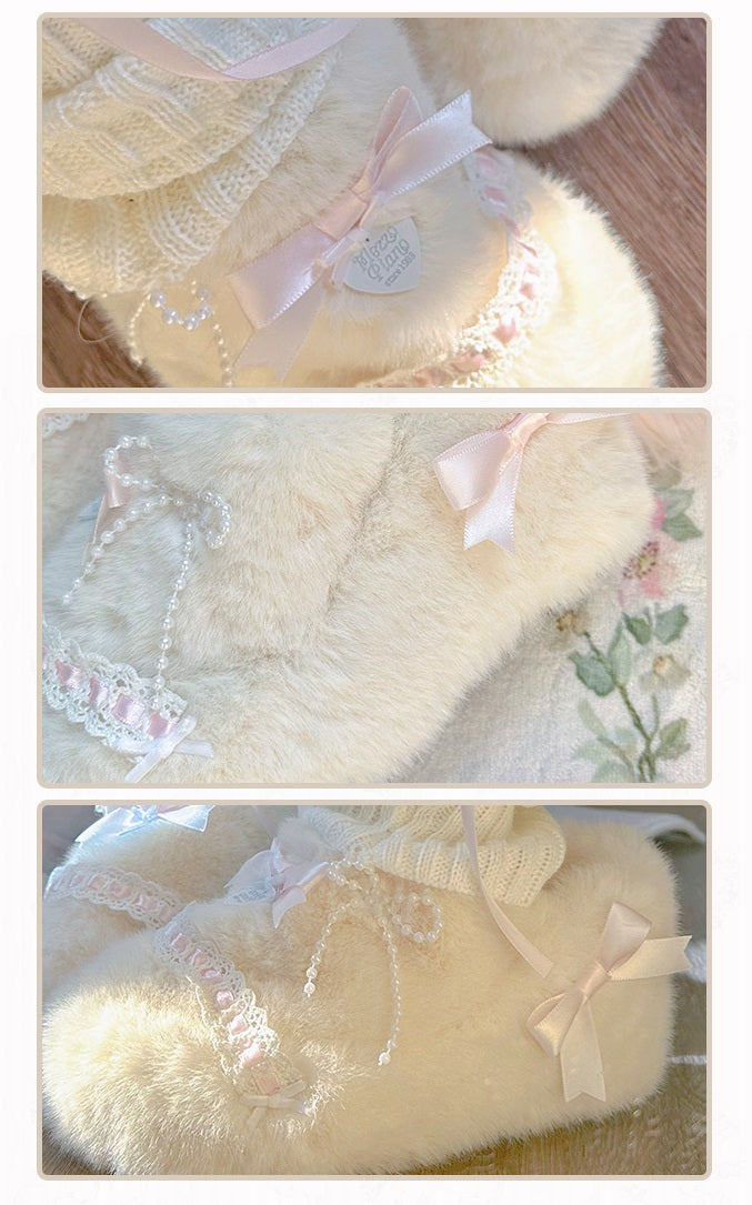 Pinky Coquette Pink Bow Lace Velvet Snow Winter Cute Slippers Shoes