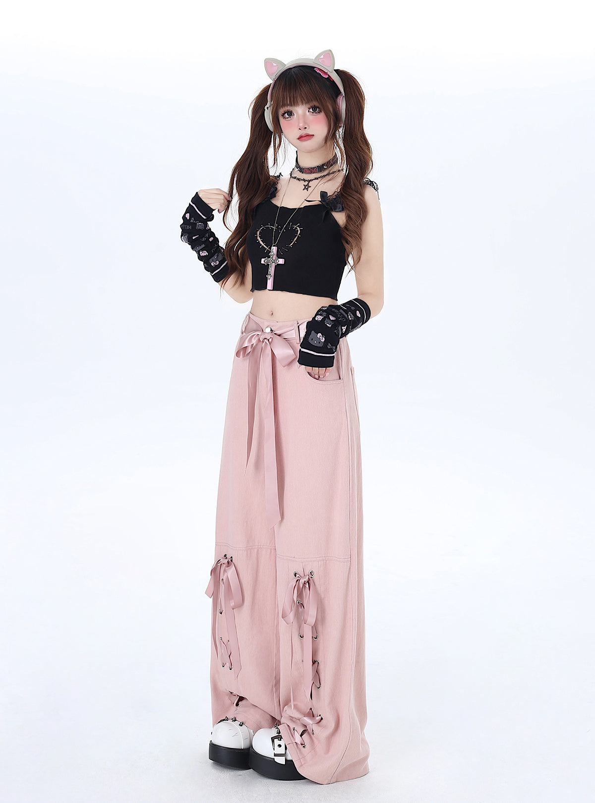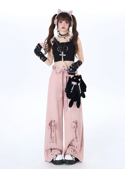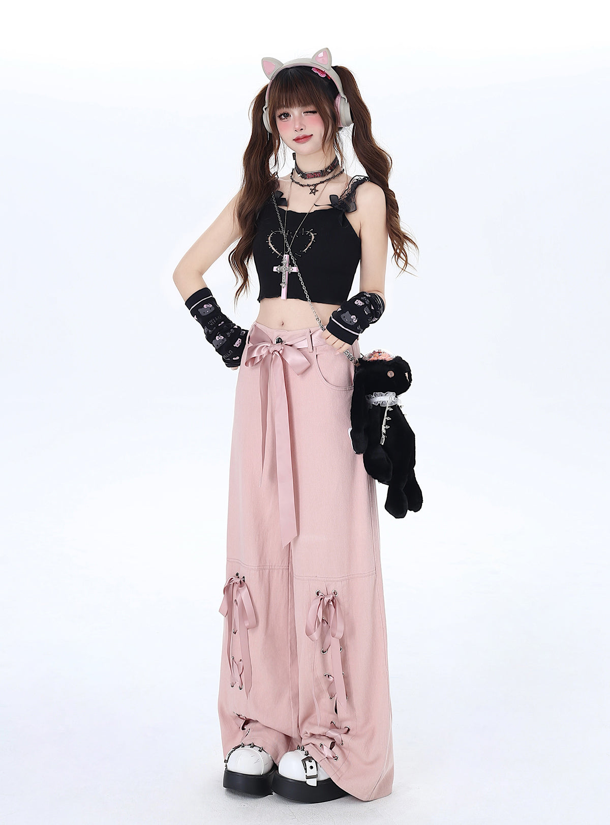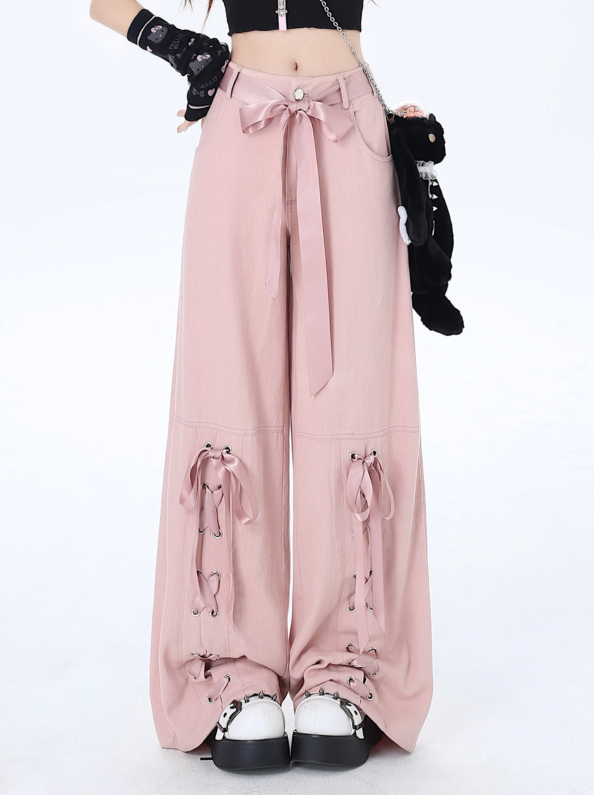 Crazy Girl Pink Mist Balletcore Bow Pink Wide Leg Jeans Pants