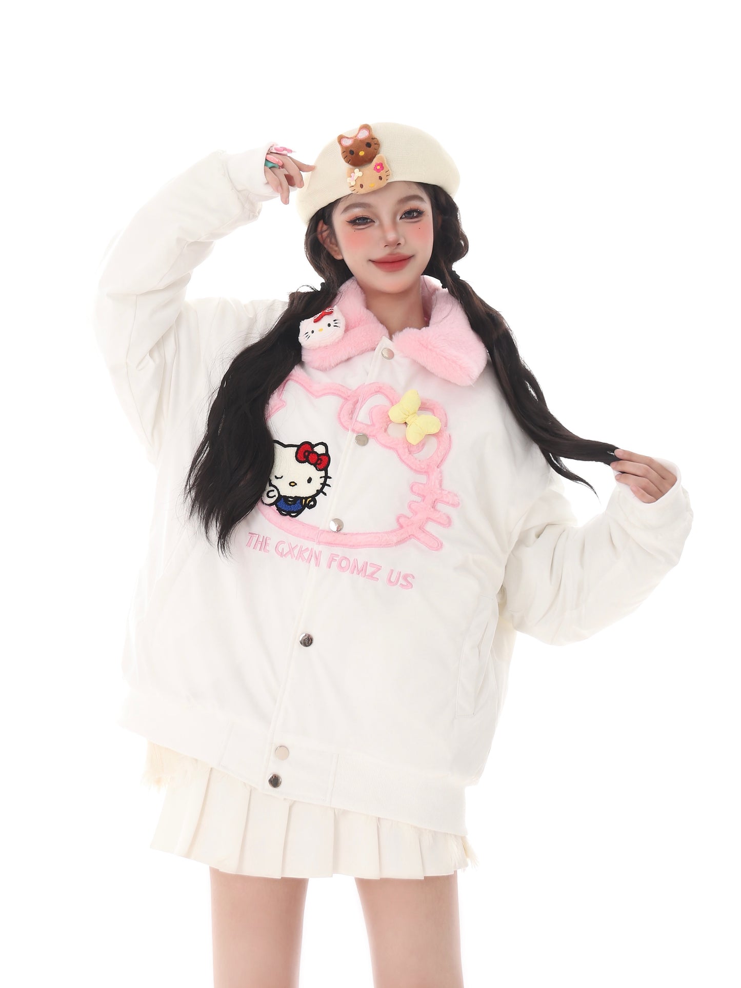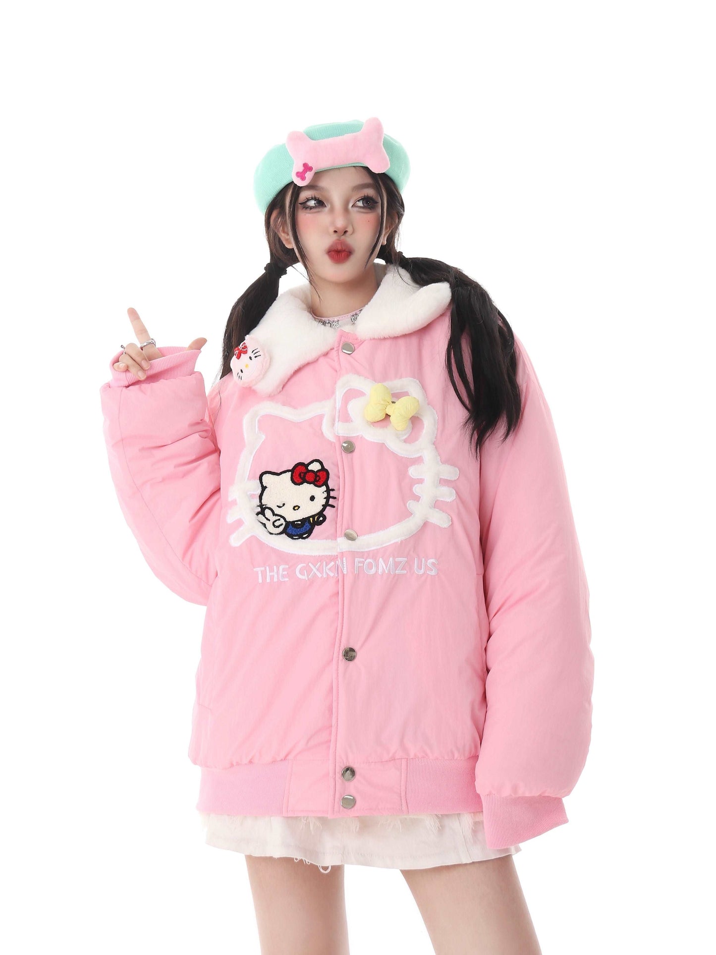Cute Cartoon Kitty Cat Collar Doll Plush Pink White Winter Coat
