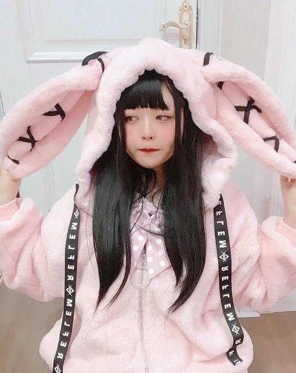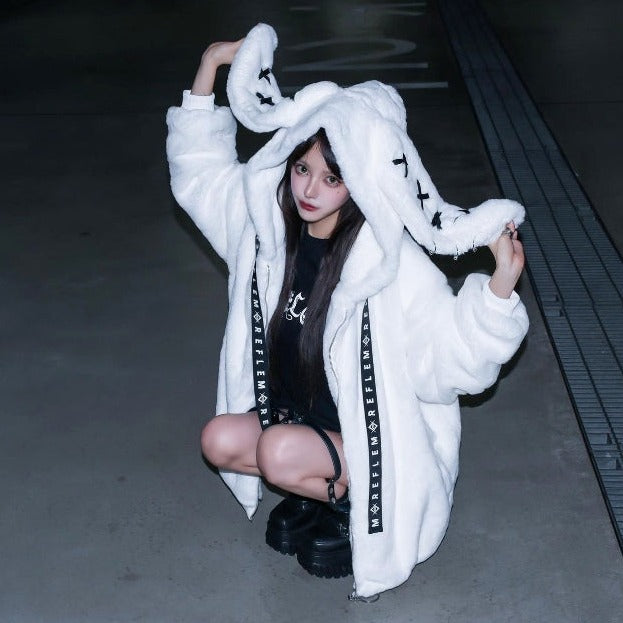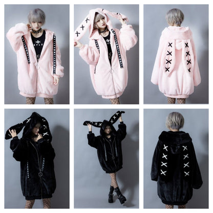 Gothic Soft Fluffy Plush Cross Pattern Rabbit Bunny Ears Pink Black Long Jacket Coat