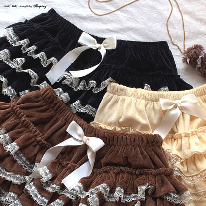Dormir Doll Lolita Winter Velvet Lace Ruffled Black Brown Cream Bloomers Shorts