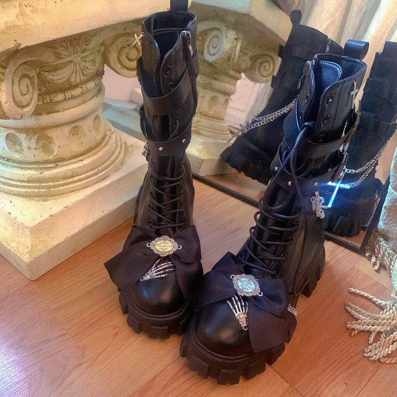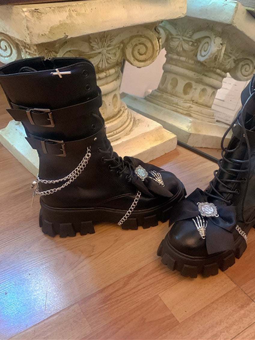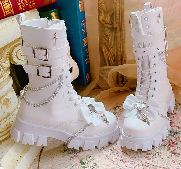 Pinky EGL Princess Bow Cross Silver Chain Winter White Black Boots Shoes