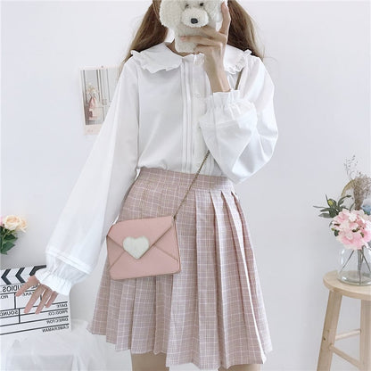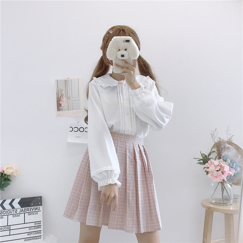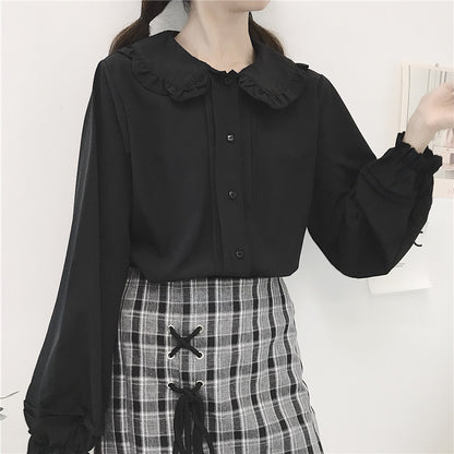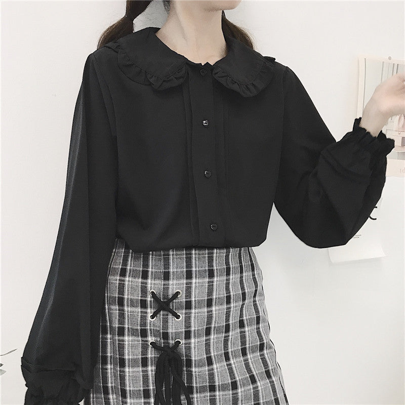 Embroidery Lace Collar Long Sleeve White Black Shirt Blouse