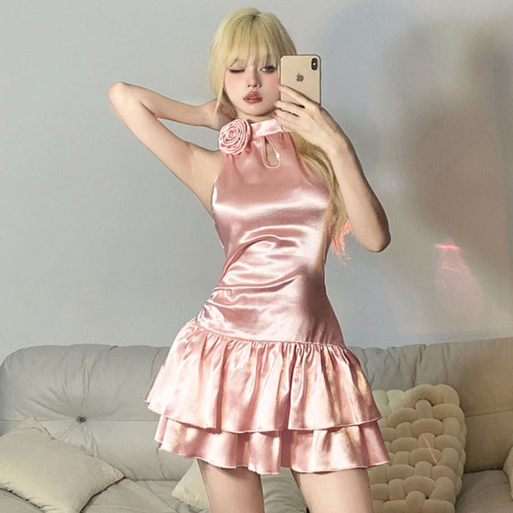 Flower Halter Neck Collar Hot Sexy Silver Summer Night Party Short Dress