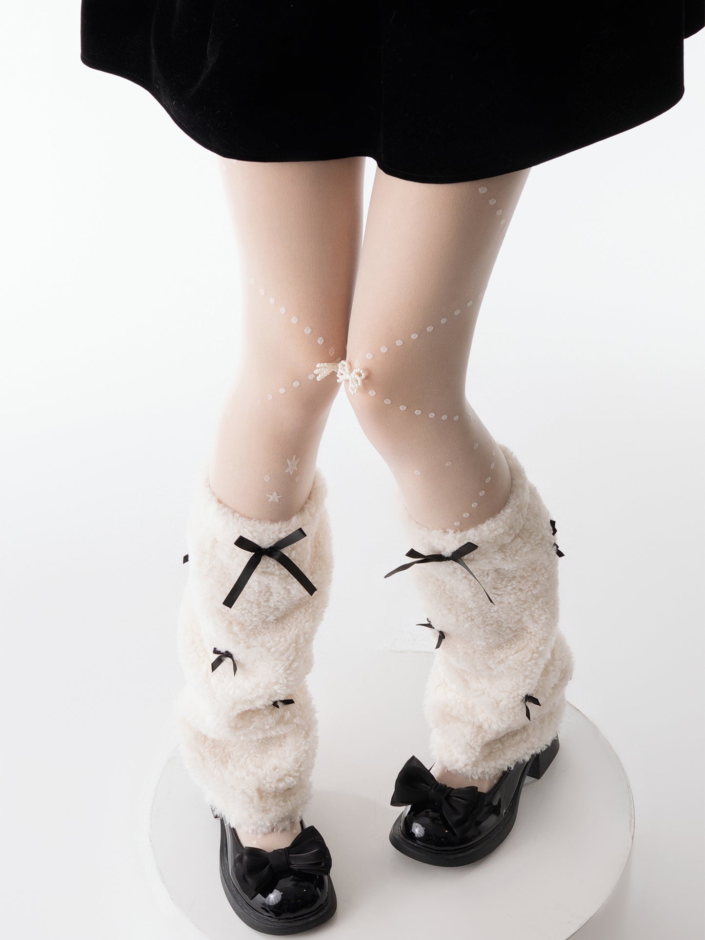 Fluffy Wool Black Bow Coquette White Brown Warm Leg Warmers