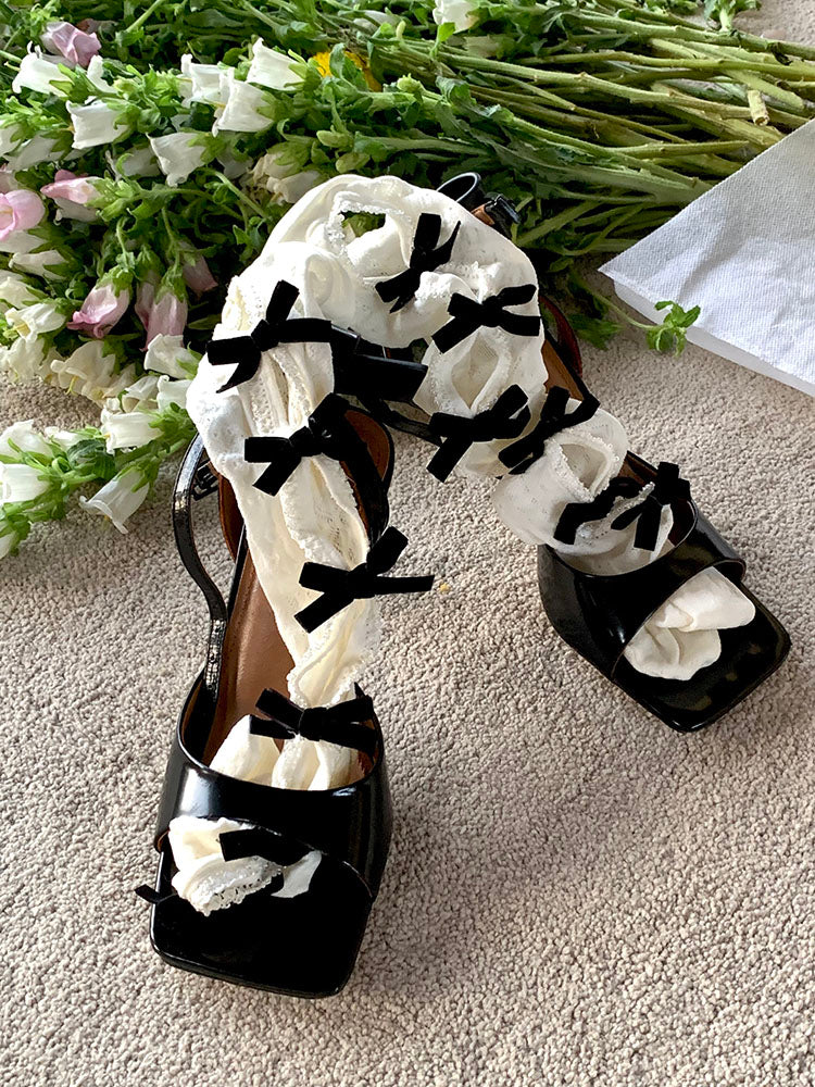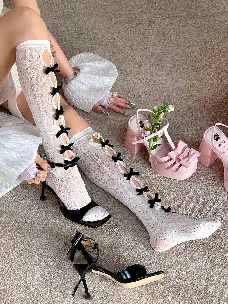 Handmade Lolita Flocked Bow Hollow Retro Tights Knee Highs Stockings