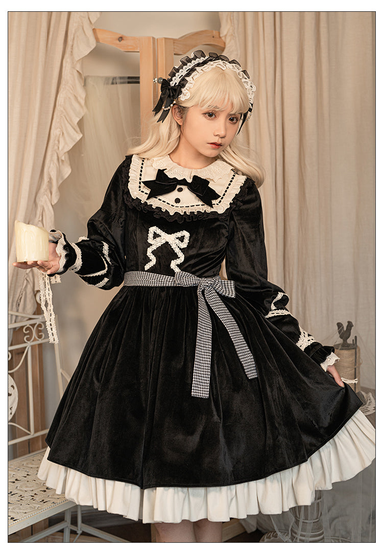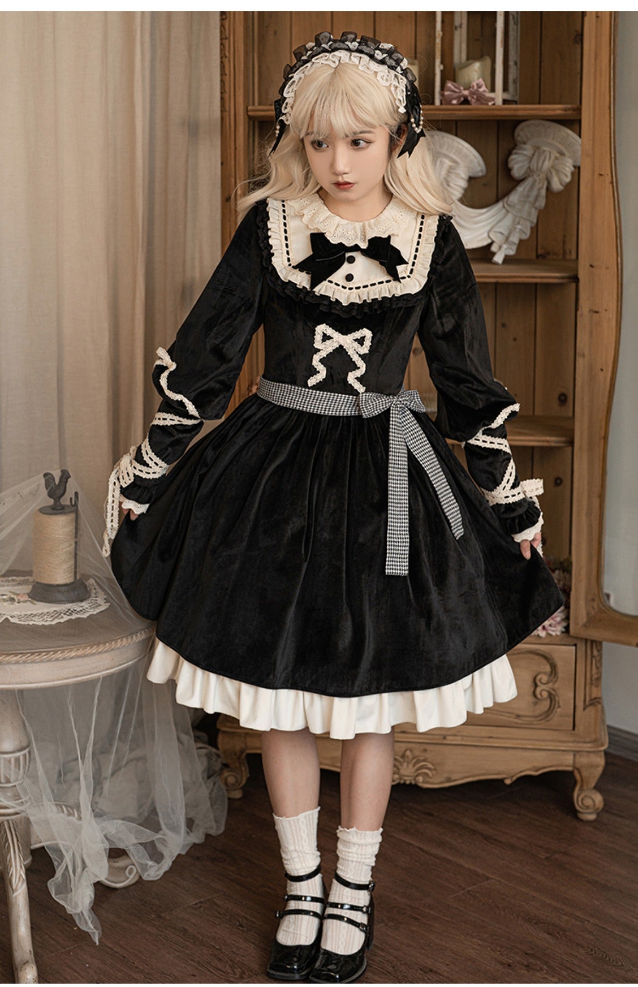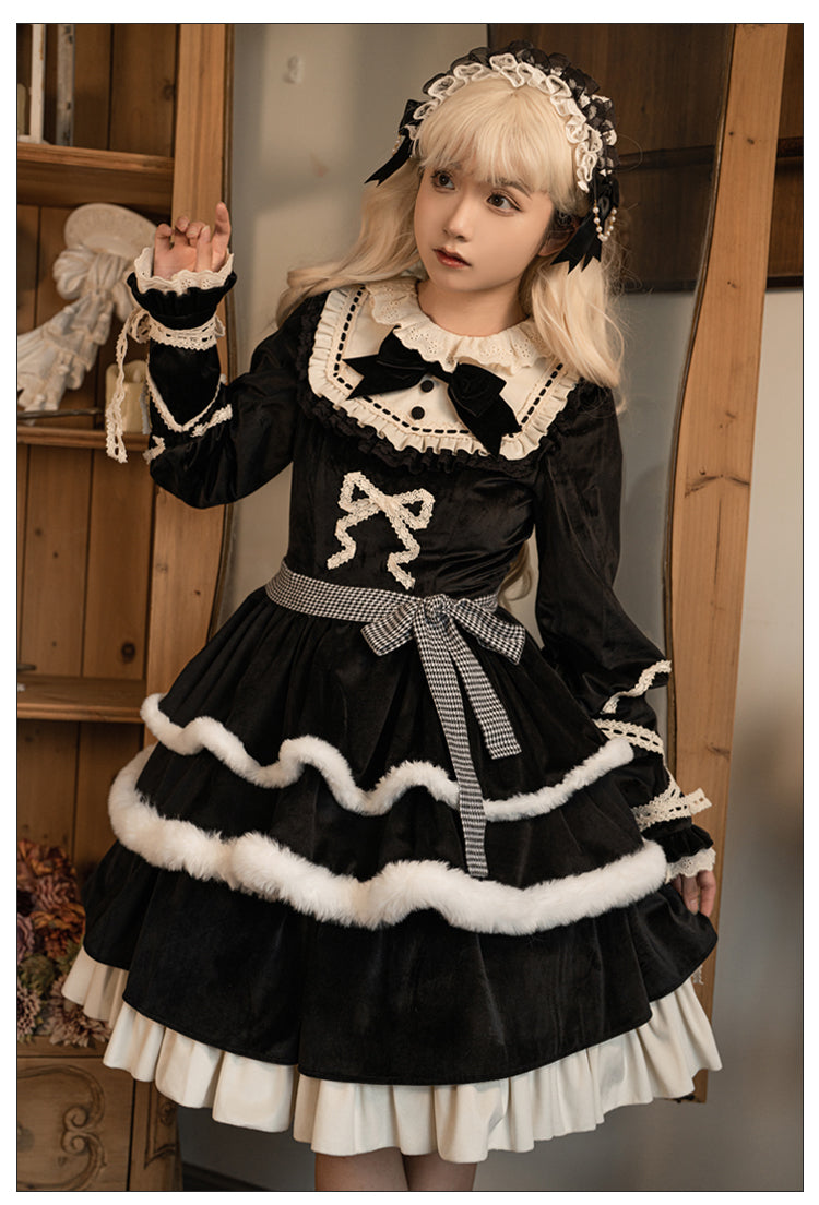 Universal Lolita Gothic Winter Ribbon Black Dress Cloak Two Piece Set