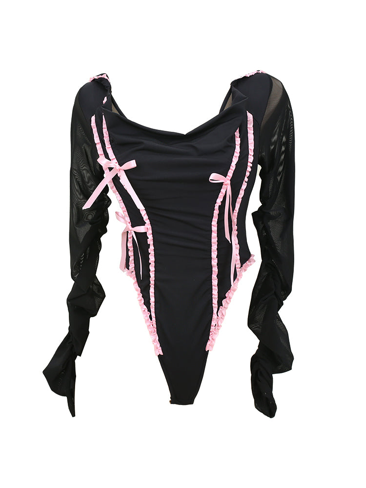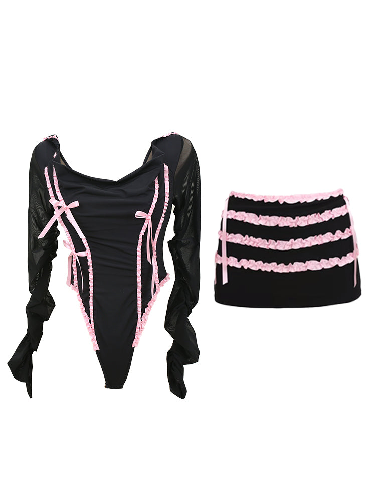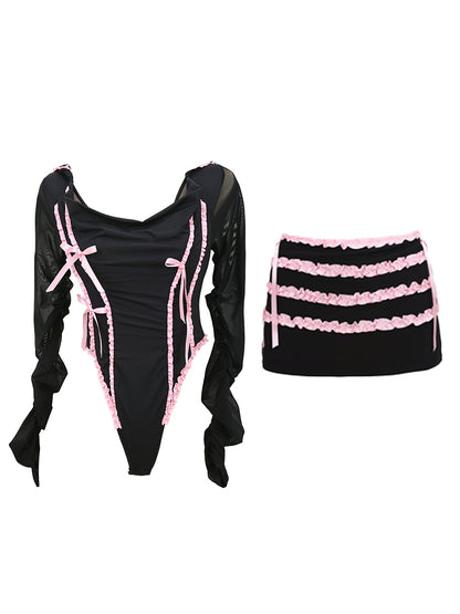 Lucia Balletcore Elegant Coquette Pink Black Lace Top Hooded Short Mini Skirt Two Piece Set