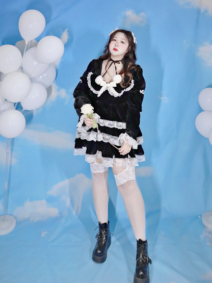 Plus Size Black & White Gothic EGL Winter Plush Velvet Long Sleeve Top & Mini Skirt Dress Two Piece Set