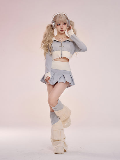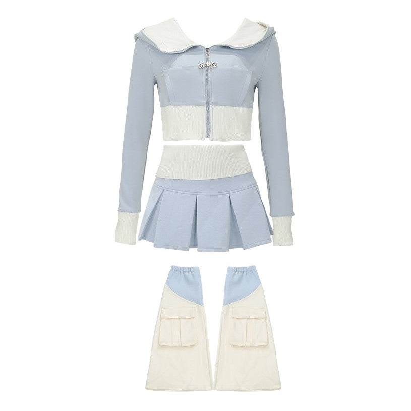 Serendipity Autumn Blue Zip Up Hoodie Jacket & Pleated Mini Skirt & Leg Warmers Three Piece Set