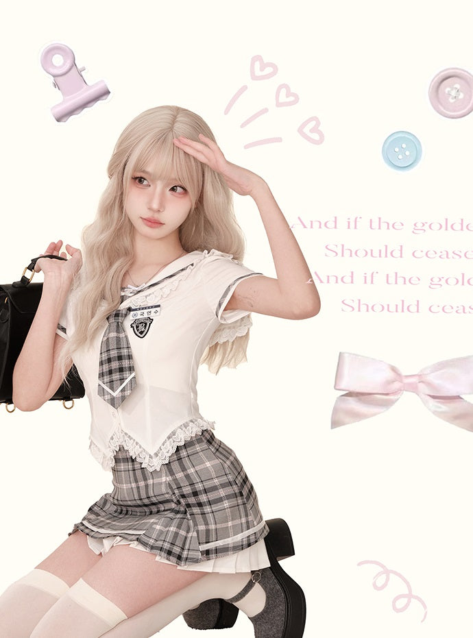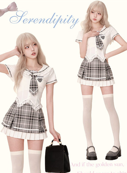 Serendipity Poly College White Shirt & Gray Plaid Skirt Two Piece Set