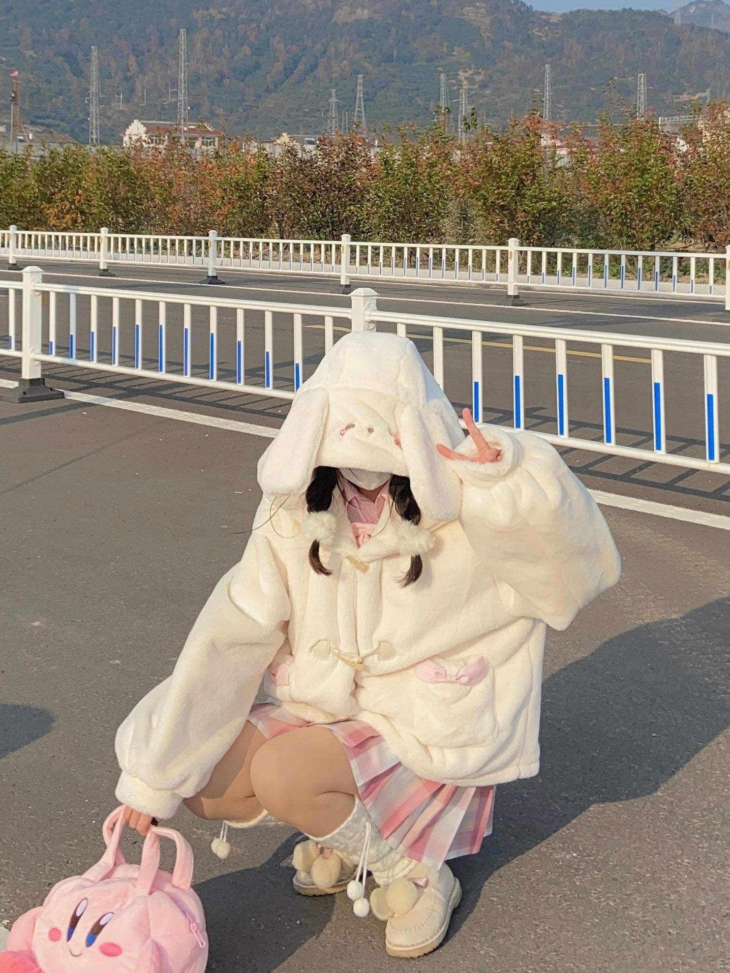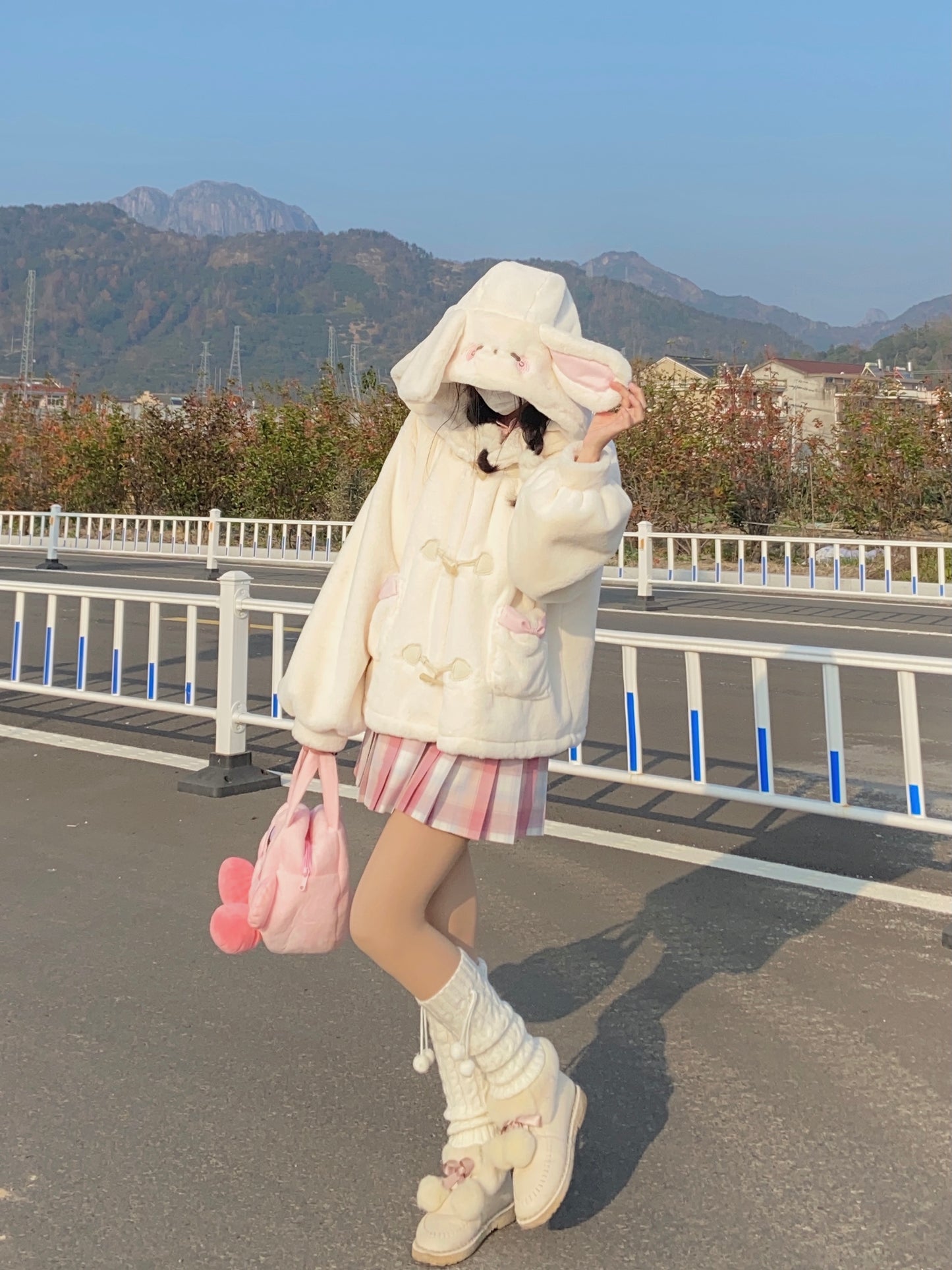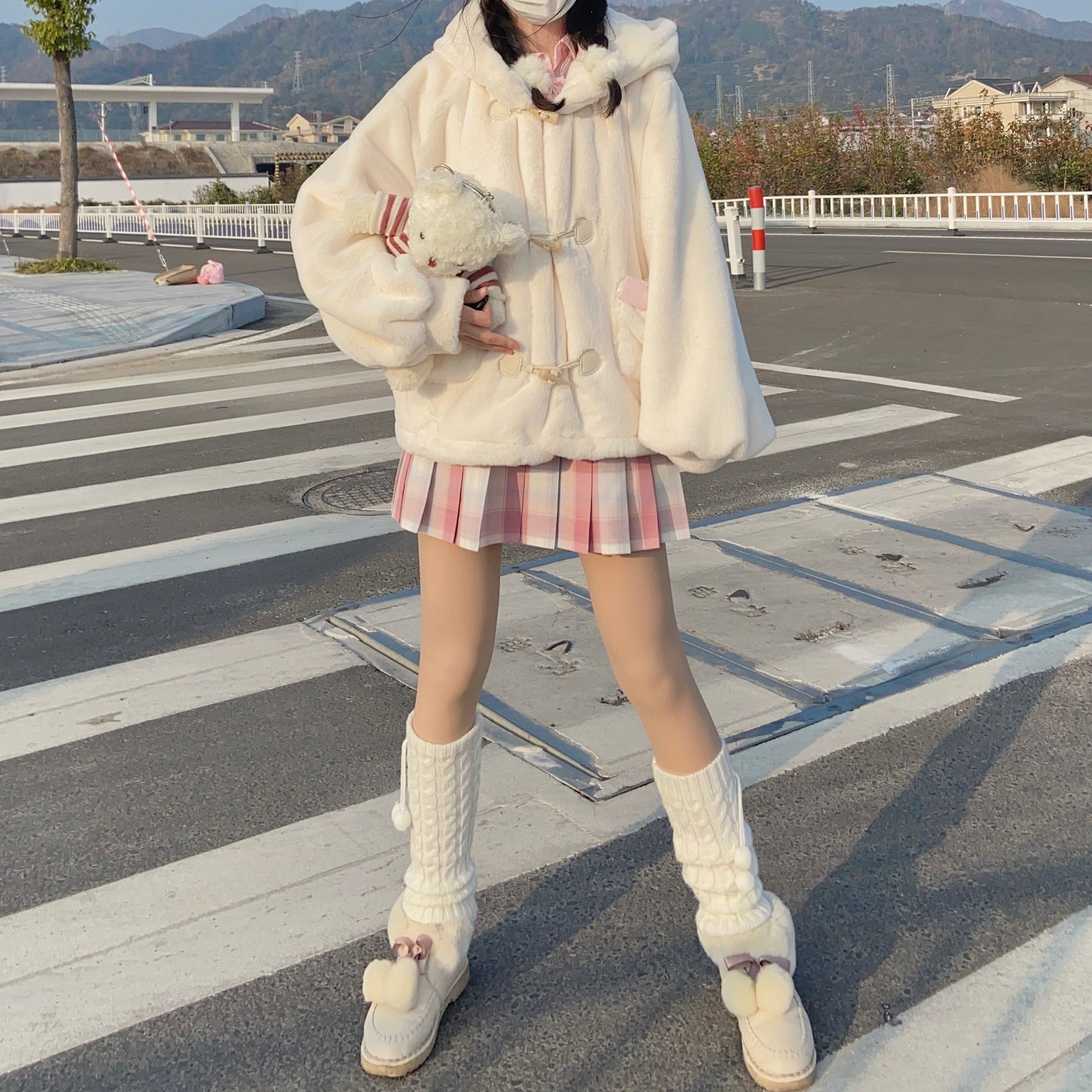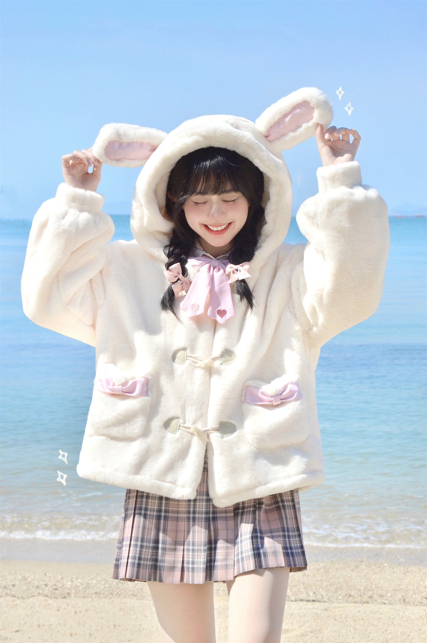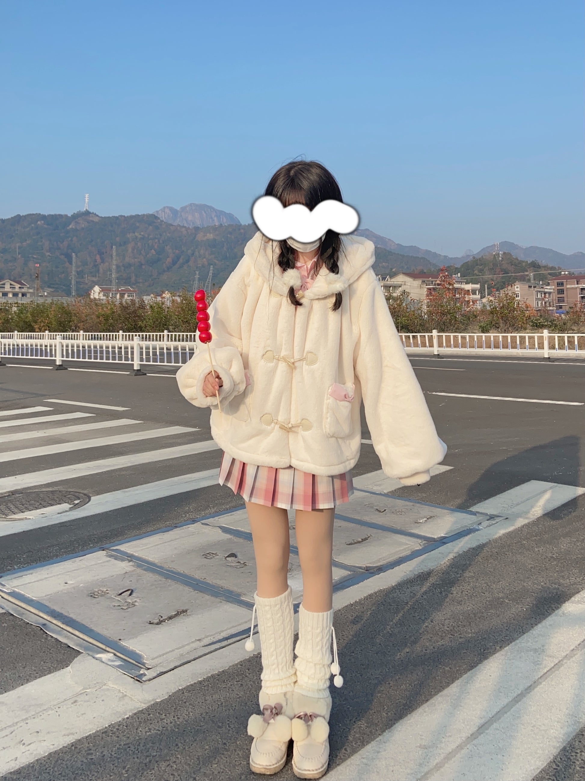 Snow Velvet Rabbit Vanilla Faux Wool Fur Plush Thick Winter White Hooded Coat