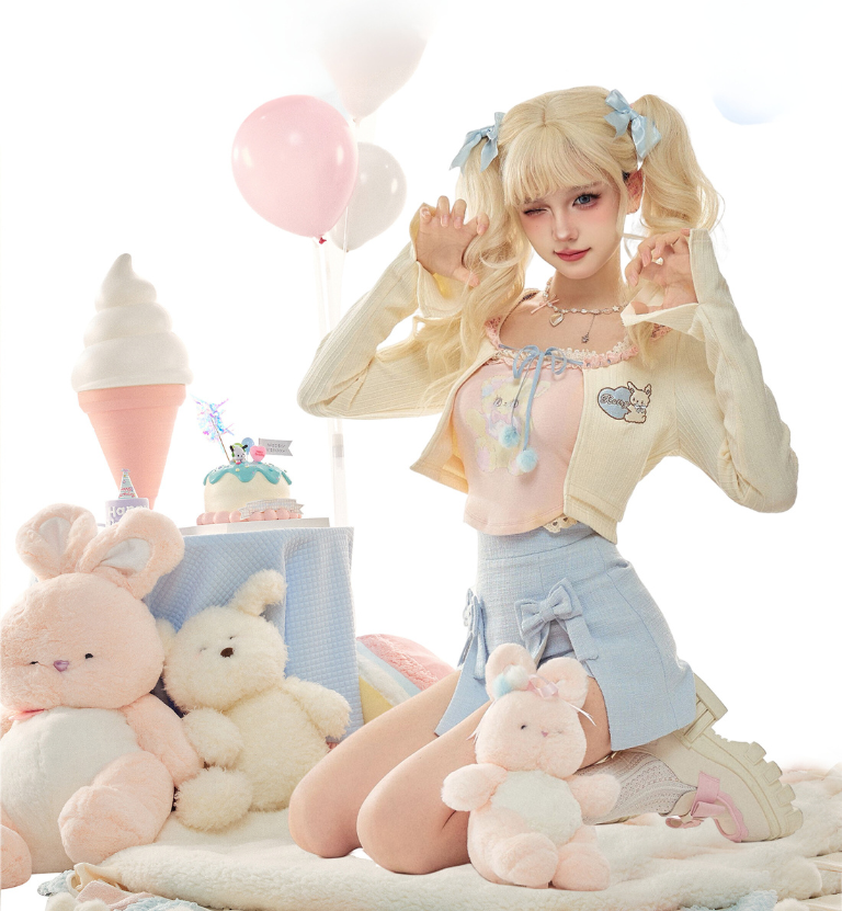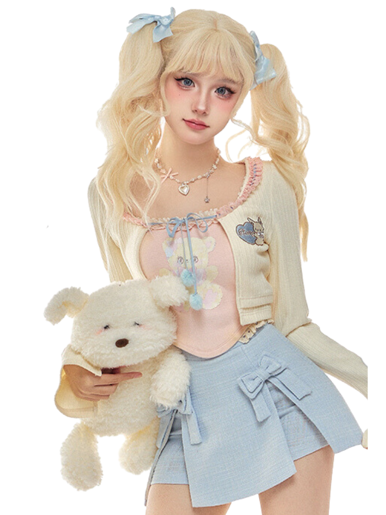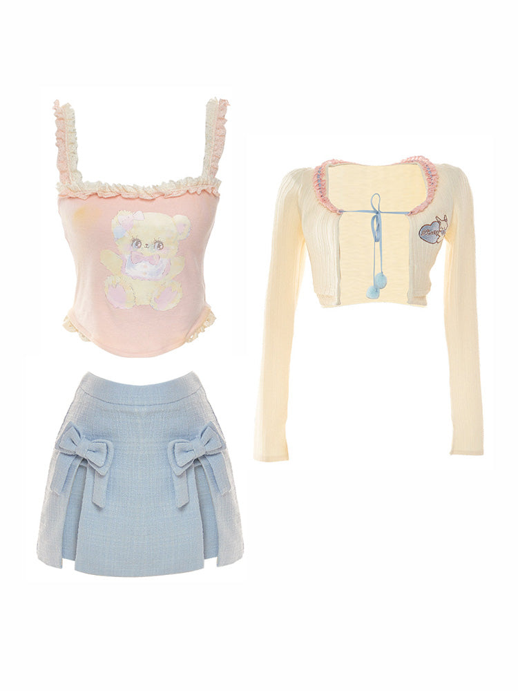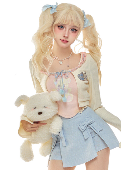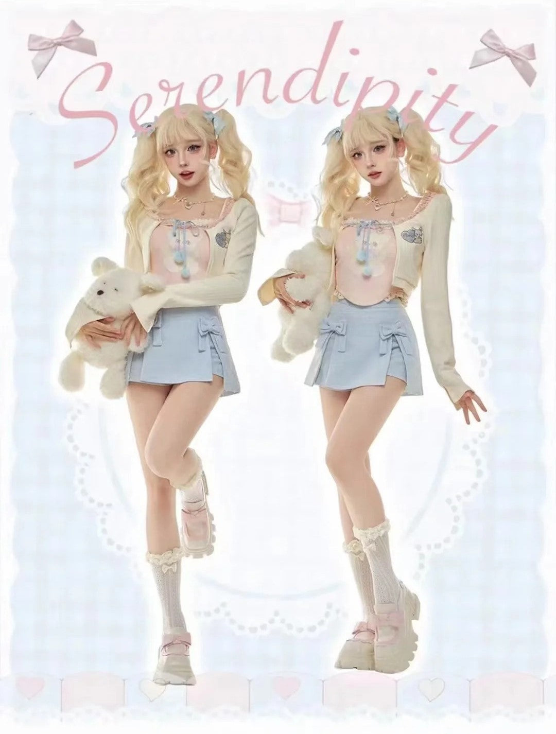 Serendipity Cream Cardigan Pink Camisole Blue Bow Mini Skirt Three Piece Set
