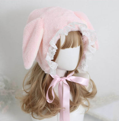 Sweet Rabbit Ear Pink & White Lace Lolita Handmade Fur Hats