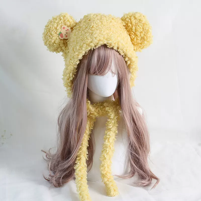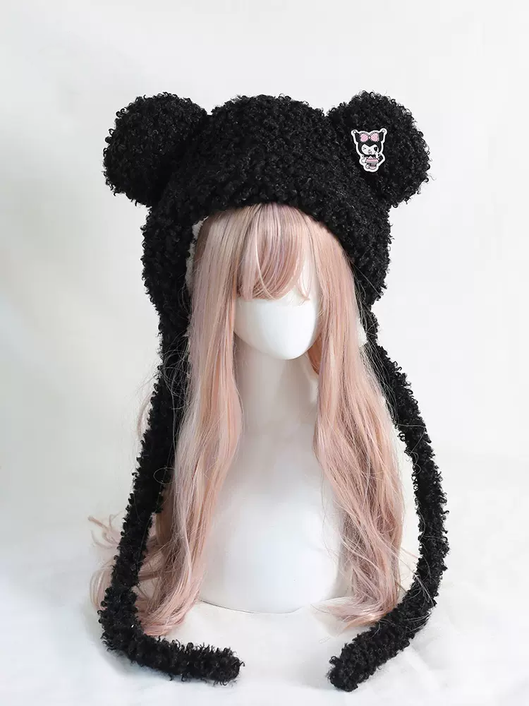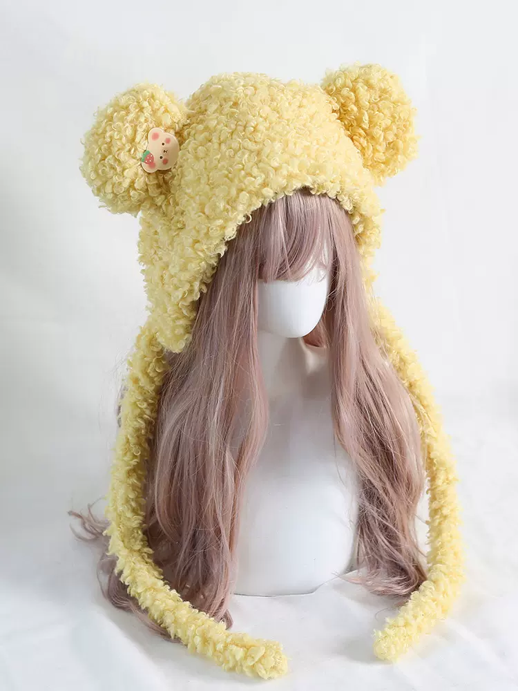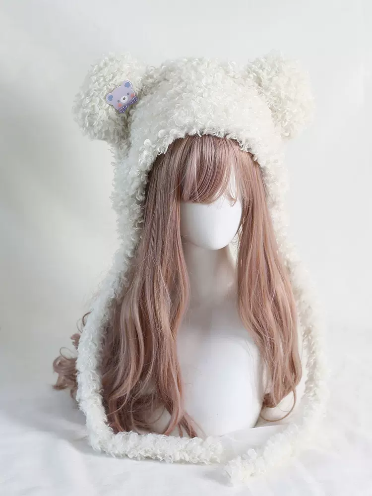 The fabric of this hat is curly and plush, with a sherpa lining and large bear ears. It's incredibly soft, providing excellent comfort and warmth. The chin strap is made from the same material and features our original design. Overall, it has a soft and cute appearance.