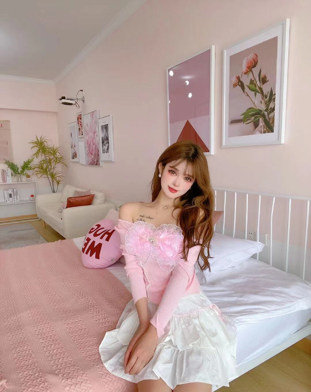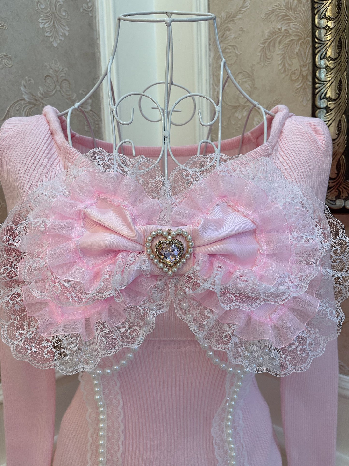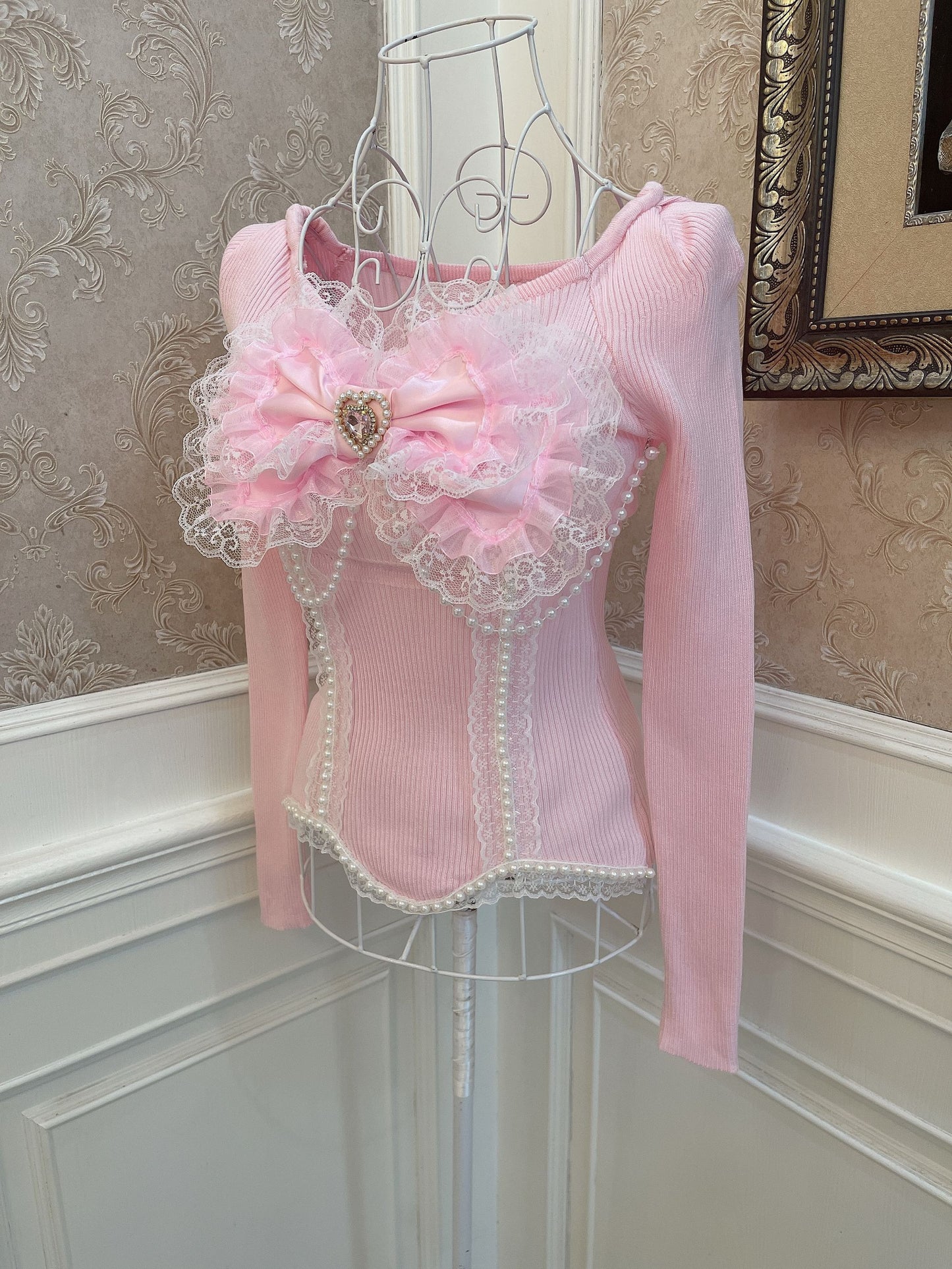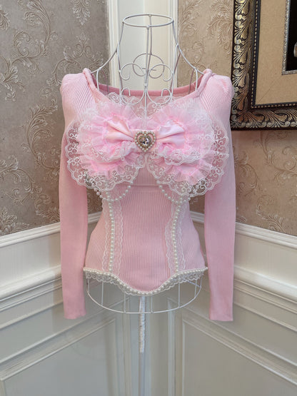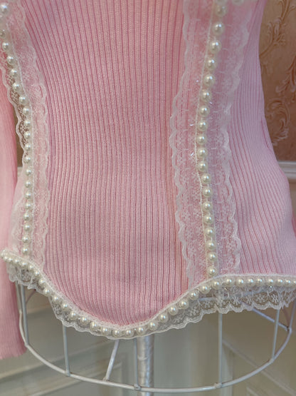 Sweetheart Princess Girly Pink Lace Bow Pearl Knit Sweater