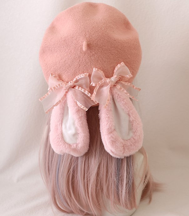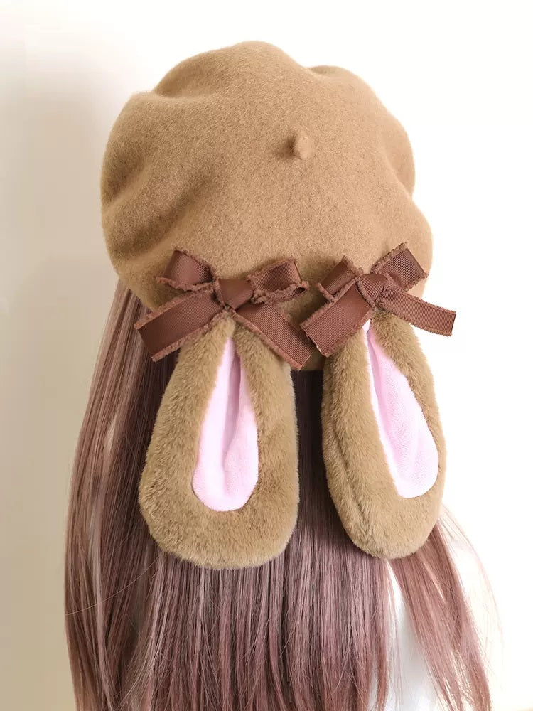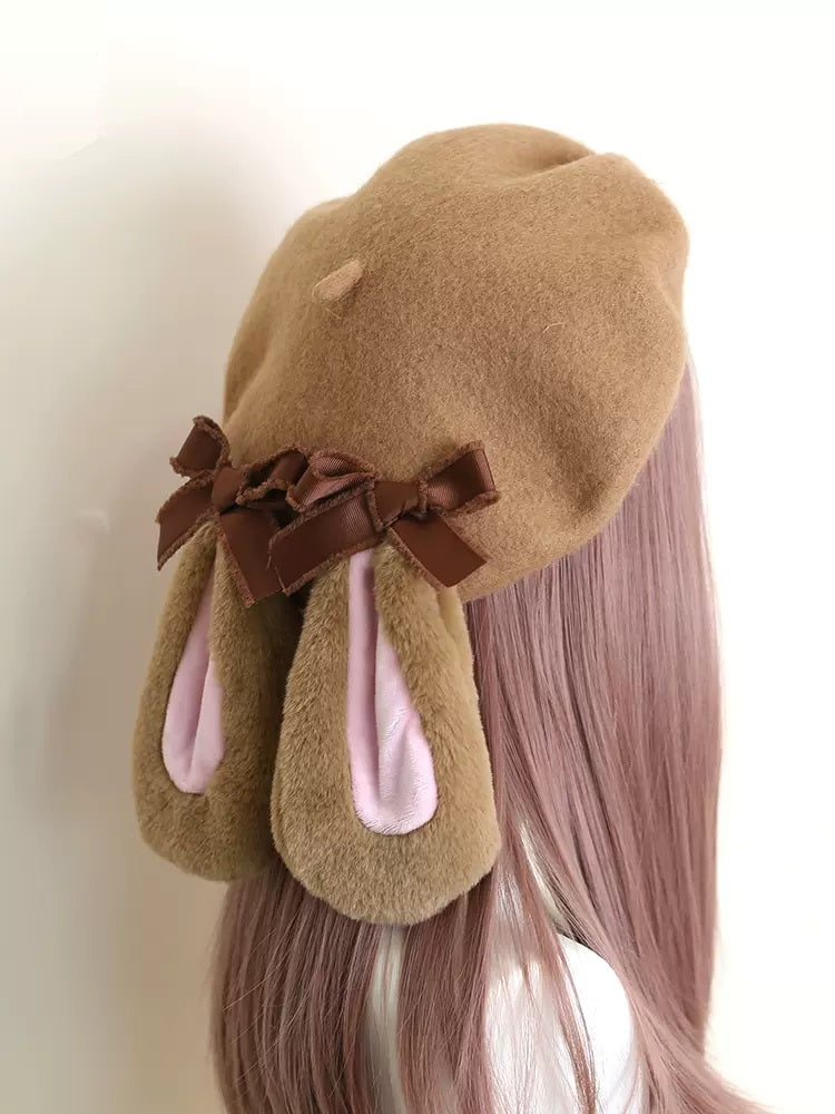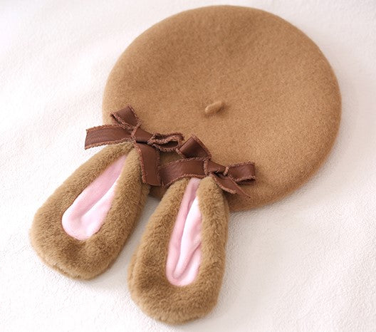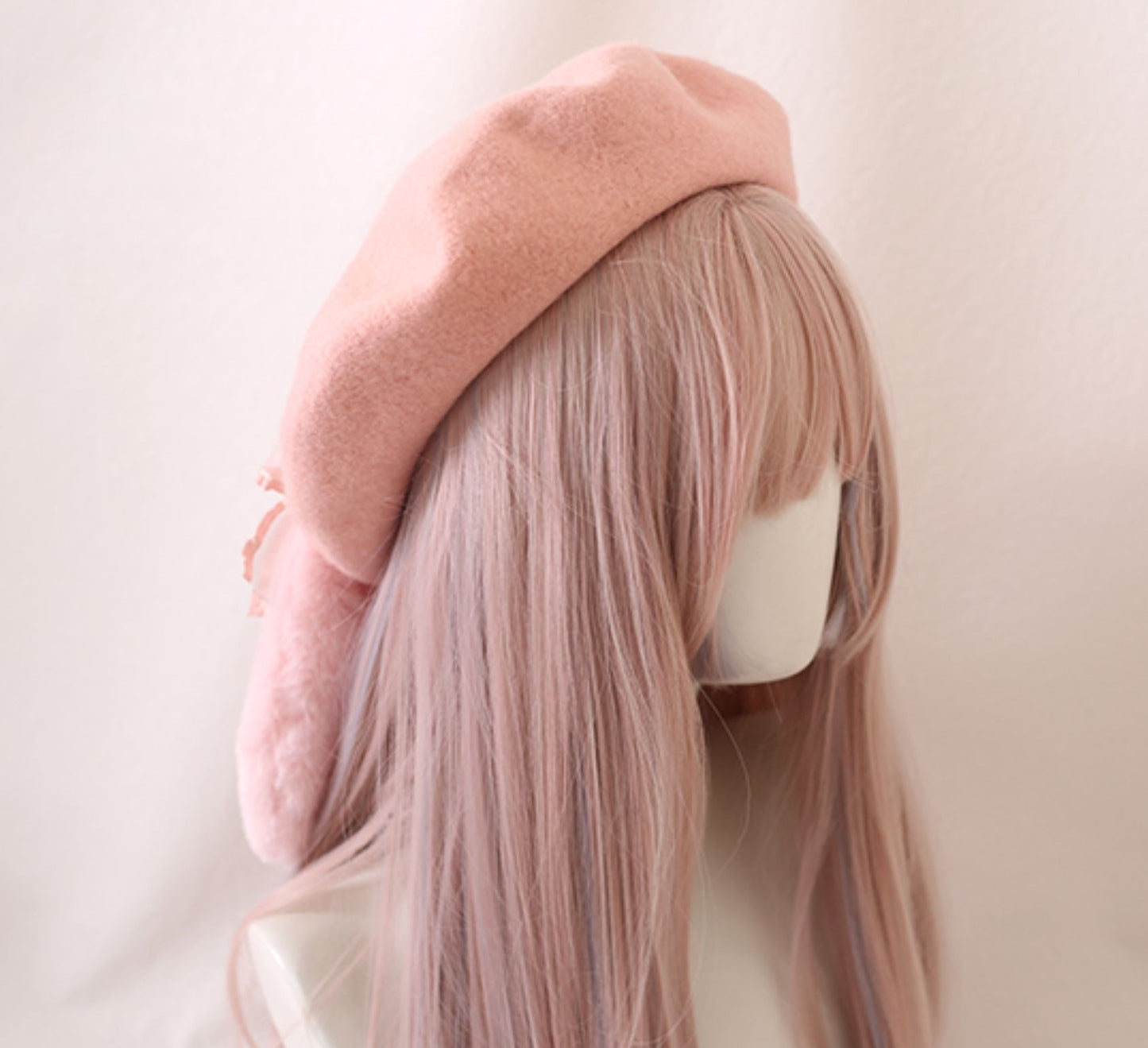 Winter Lolita Pink & Brown Lop Rabbit Ears Cute Handmade Beret Hats