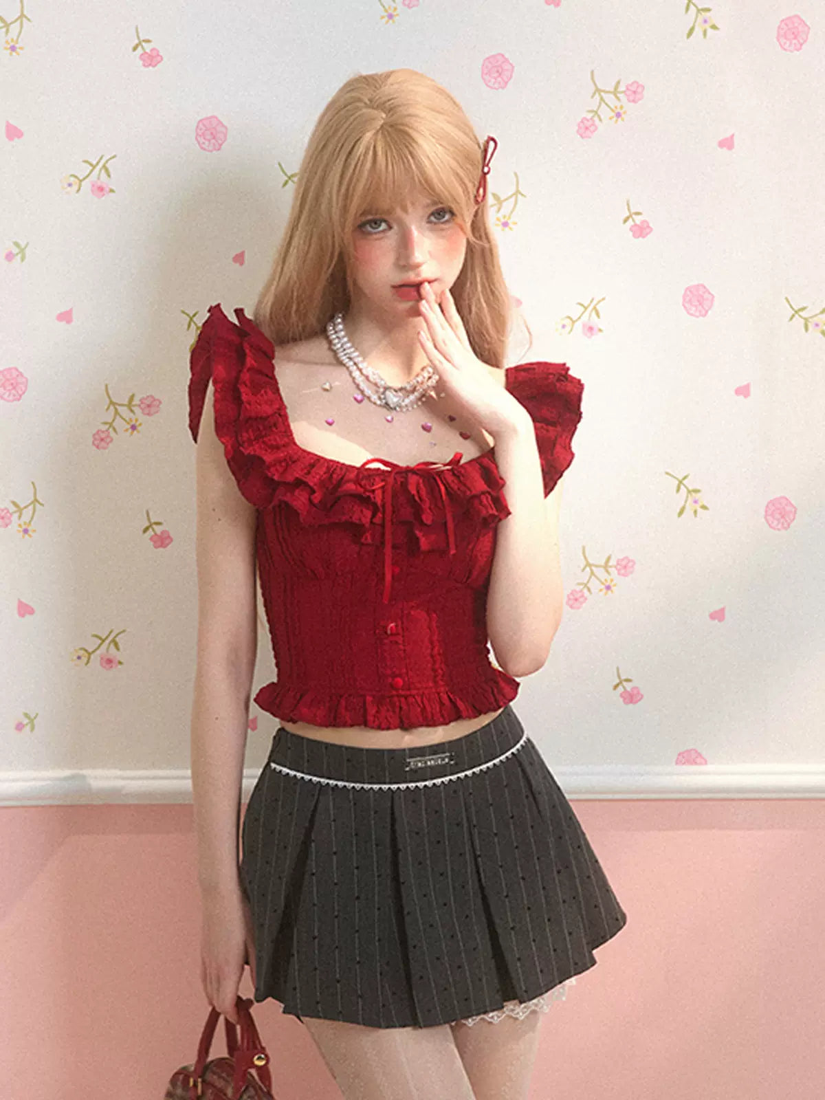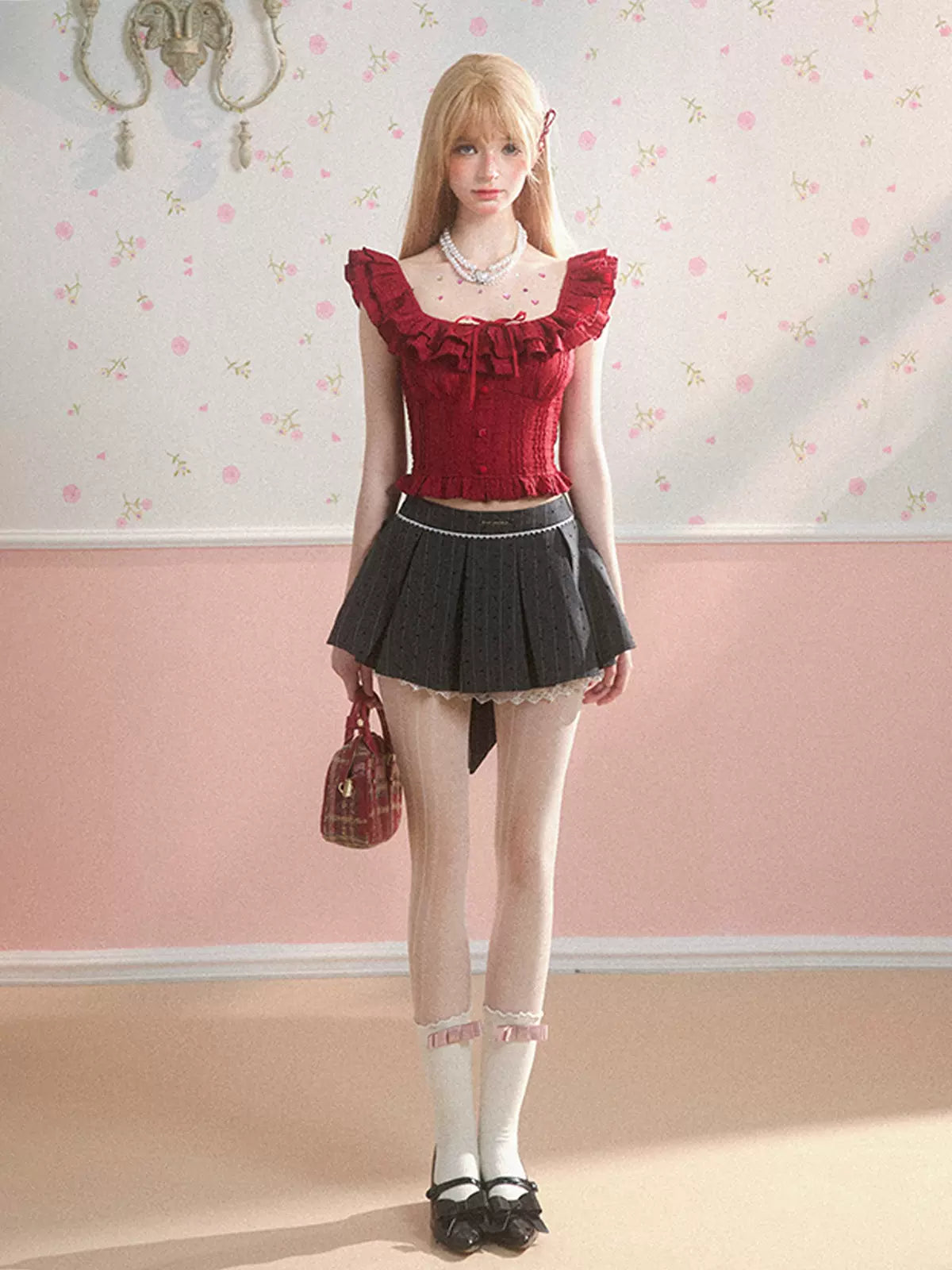 Young Eyes Agent Red Top & Gray Striped Bow Skirt Two Piece Set