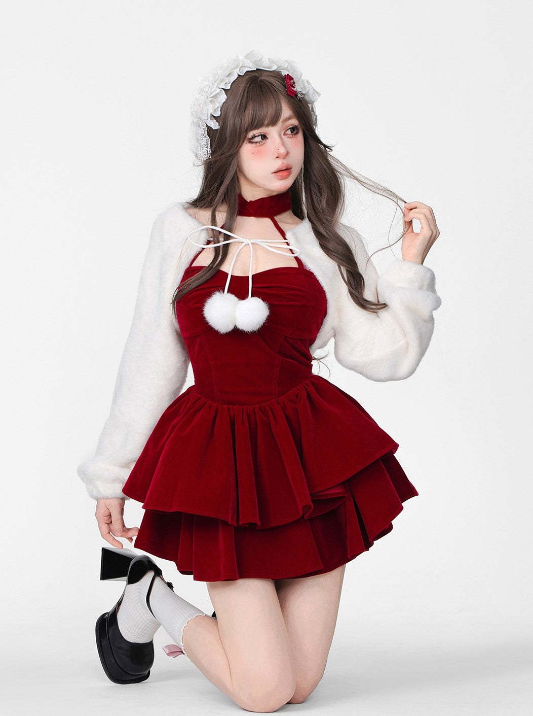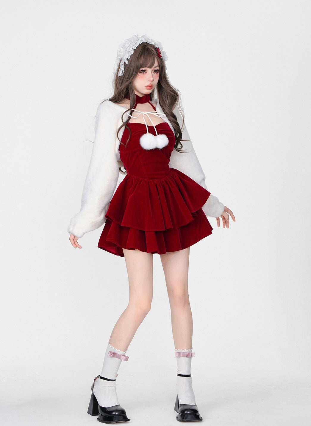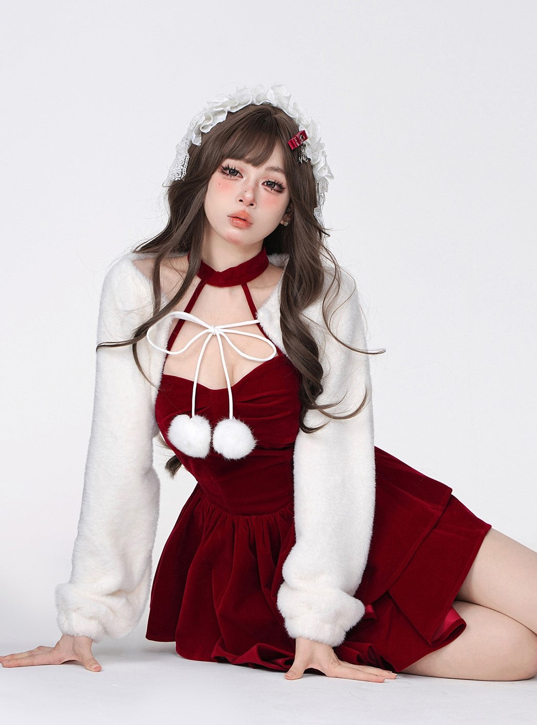 Young Eyes Winter Elf Princess Red Velvet Halter Neck Dress & Little White Jacket Two Piece Set