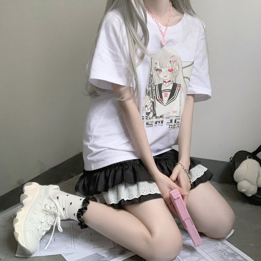 Angel Gunslinger Girl Black White Print Cotton Short Sleeved Oversize T-shirt