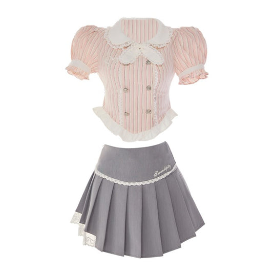 Serendipity Striped Pink Shirt Blouse & Gray Pleated Mini Skirt Two Piece Set