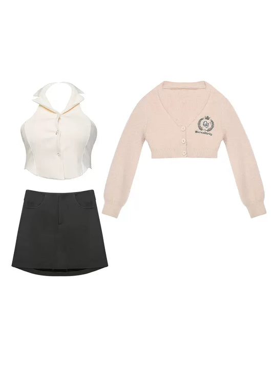 Serendipity School Girl Fuzzy Pink Cardigan & White Vest Top & Gray Skirt Three Piece Set
