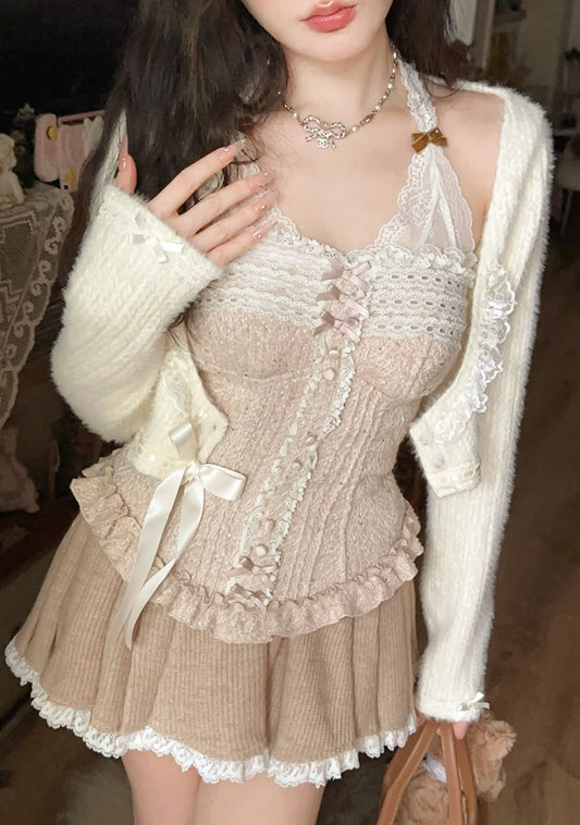 Strawberry Wheat Bonbon Pink Cream Corset & Cardigan Two Piece Set