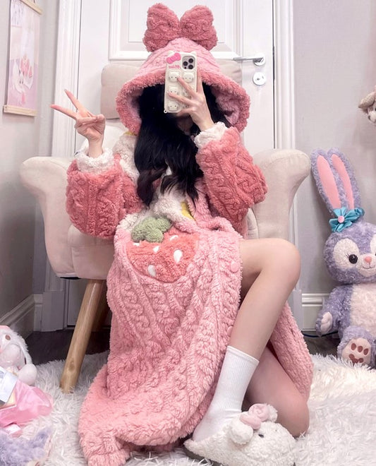 Strawberry Pink Thick Winter Pajamas Hooded Bathrobe & Pants Set