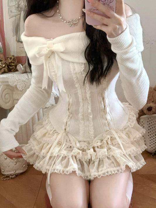 Sweet Fragrance Bonbon Pink Cream Sweater Top & Skirt Two Piece Set