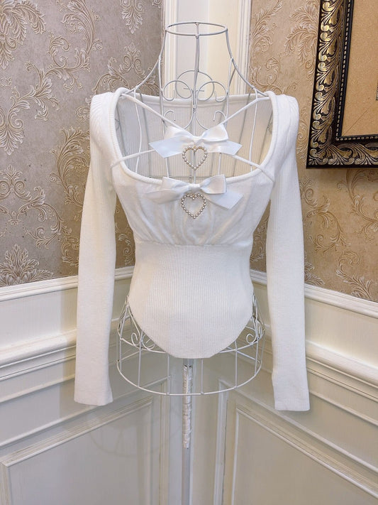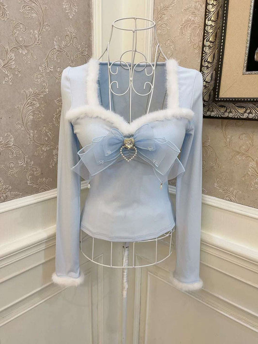 Sweetheart Princess Cross Bow Halter Top Long Sleeve Blue White Pink Red Sweater Top