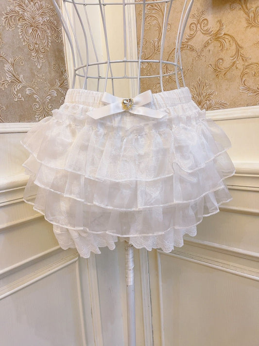 Sweetheart Princess Bow Layered Ruffled White Pink Gathered Short Skirt Bloomers