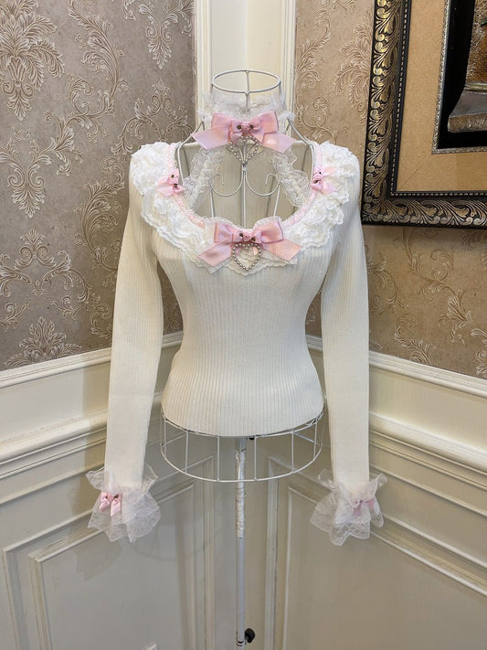 Sweetheart Princess Girly Pink Lace Bow Pearl Knit Sweater
