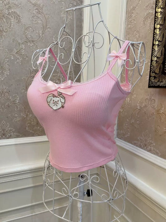 Sweetheart Princess Romantic Pink Vintage Coquette White Ribbon Strap Camisole