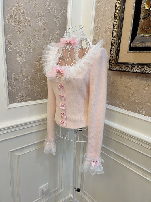 Sweetheart Princess Vintage Coquette Pastel Lace Bow Pink Cardigan Sweater