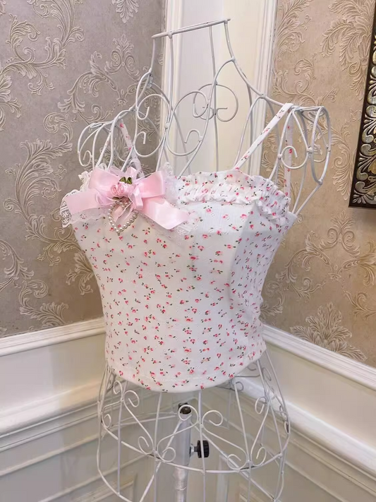 Sweetheart Princess Rose Floral Print White Pink Bow Coquette Tank Top Strap Camisole