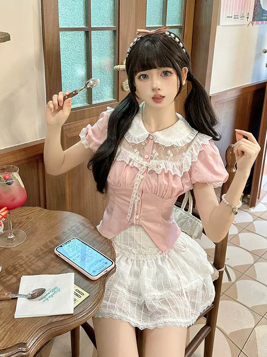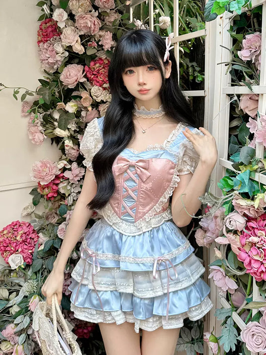 Coquette Fleur Girl Lace Pink Blouse Top & Vest & Skirt Three Piece Set