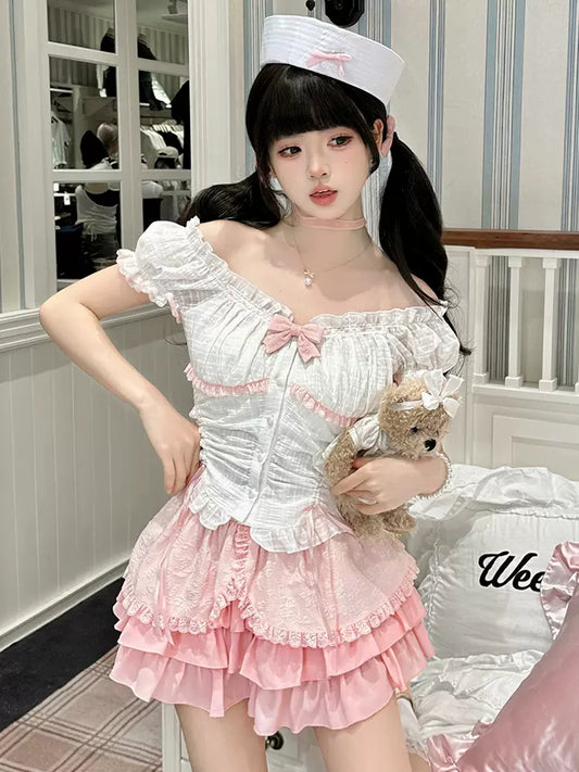 Peach Ice Cream White Top & Pink Skirt Two Piece Set
