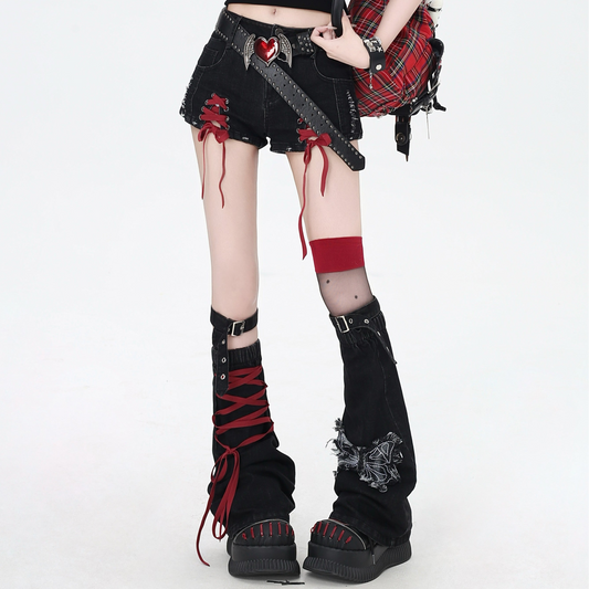 Crazy Girl Killer Legs Black Gray Red Denim Shorts Leg Warmers