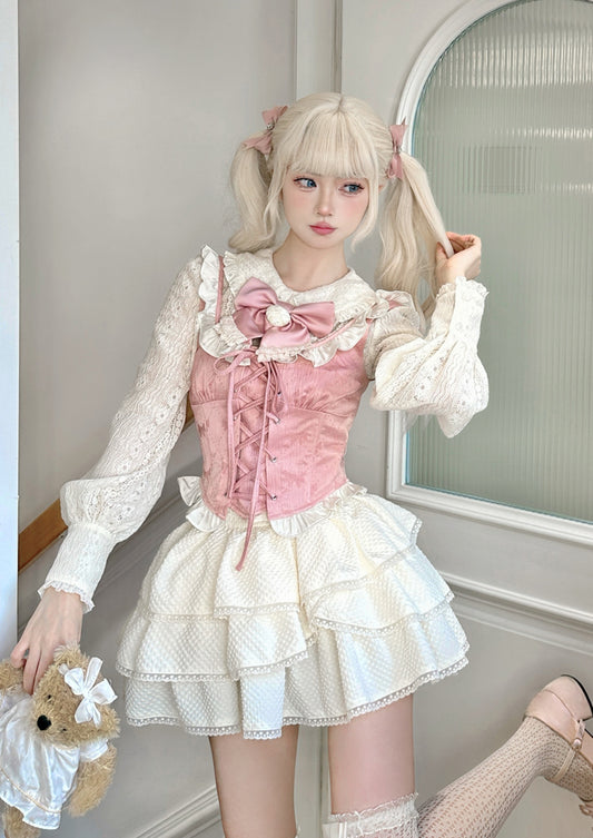 Coquette Fleur Girl Lace Pink Blouse Top & Vest & Skirt Three Piece Set