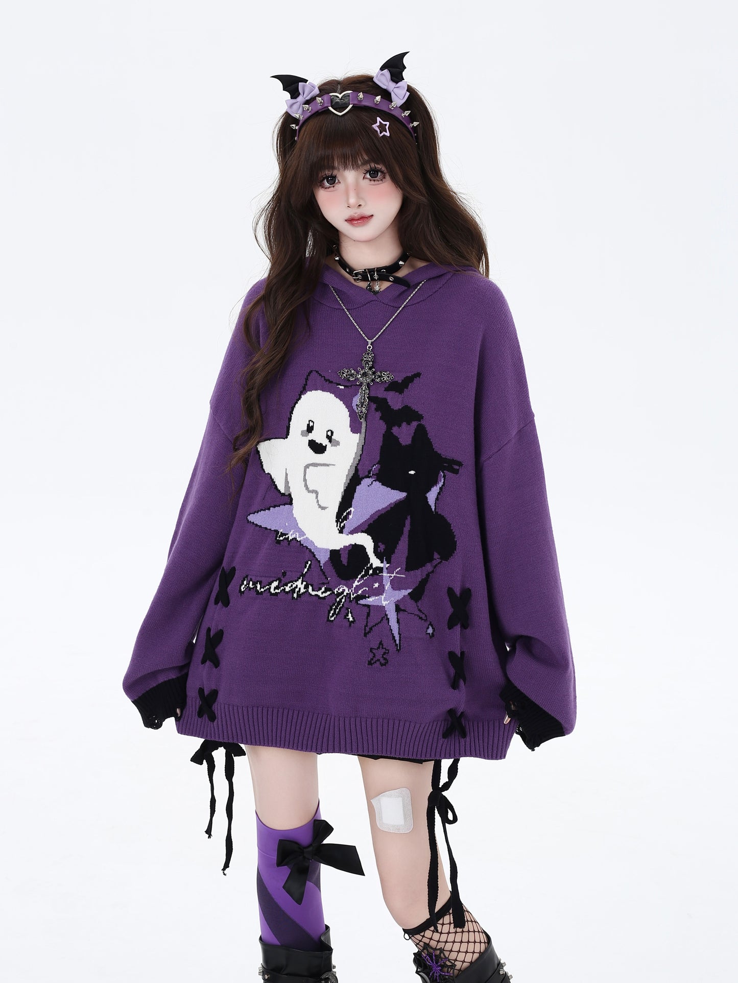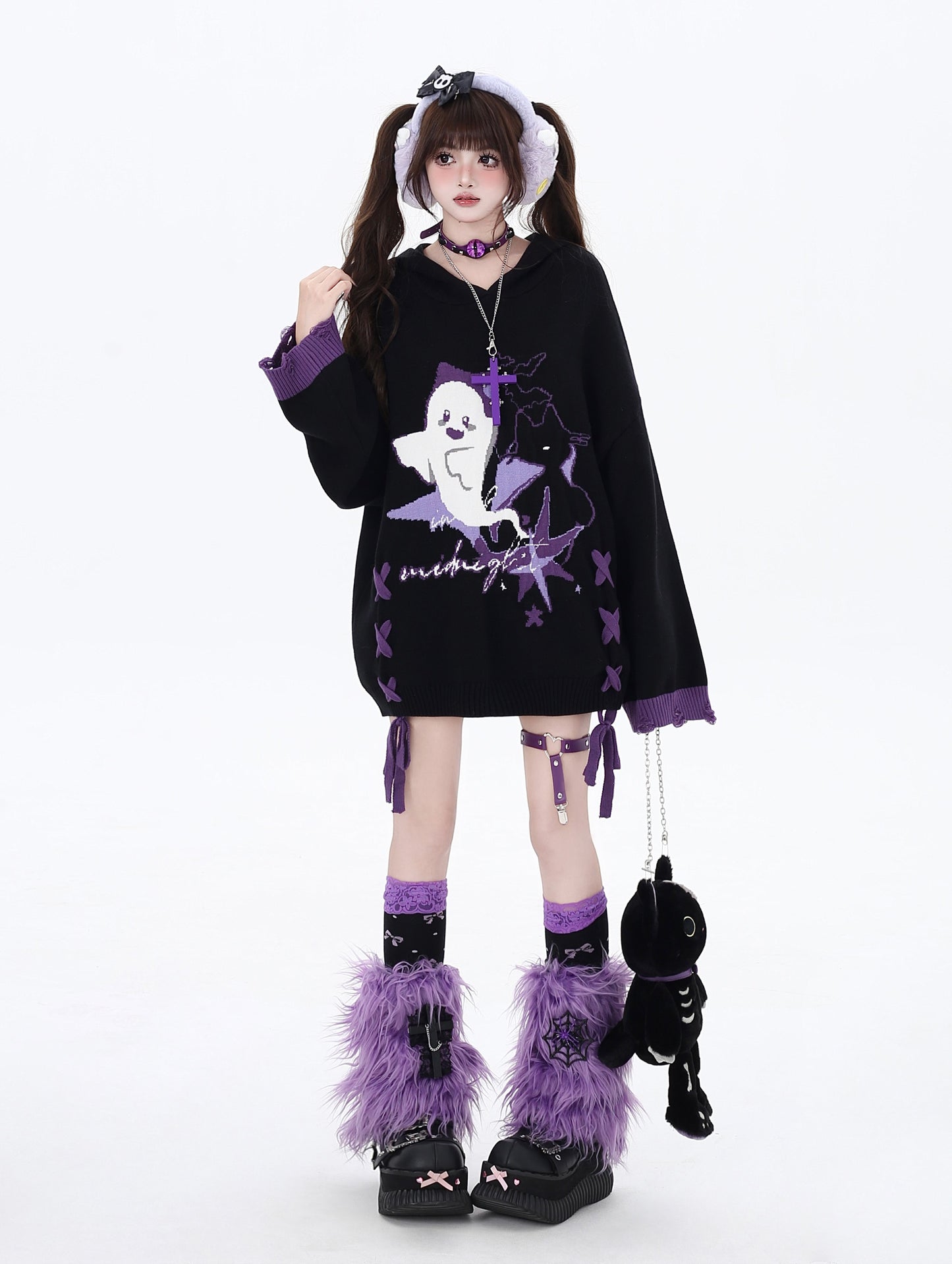 Crazy Girl Halloween Little Ghost Purple Black Knit Sweater