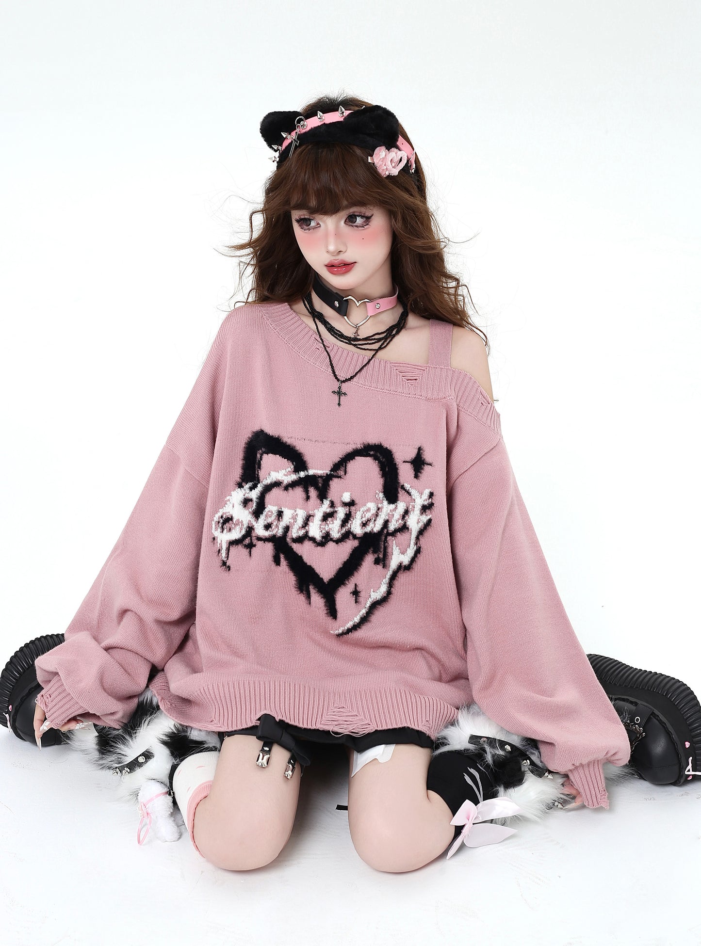 Crazy Girl Sentient Heart Black White Pink Blue Knit Off Shoulder Sweater