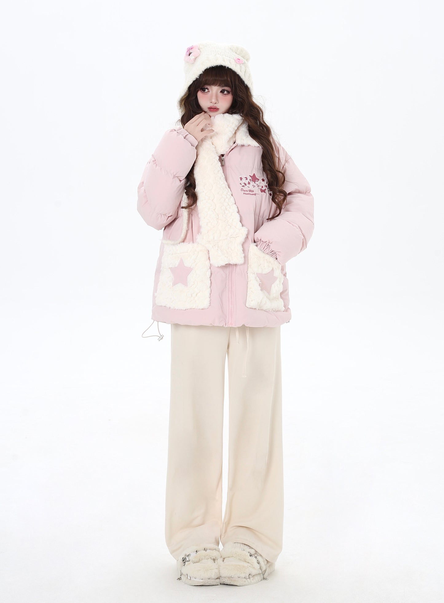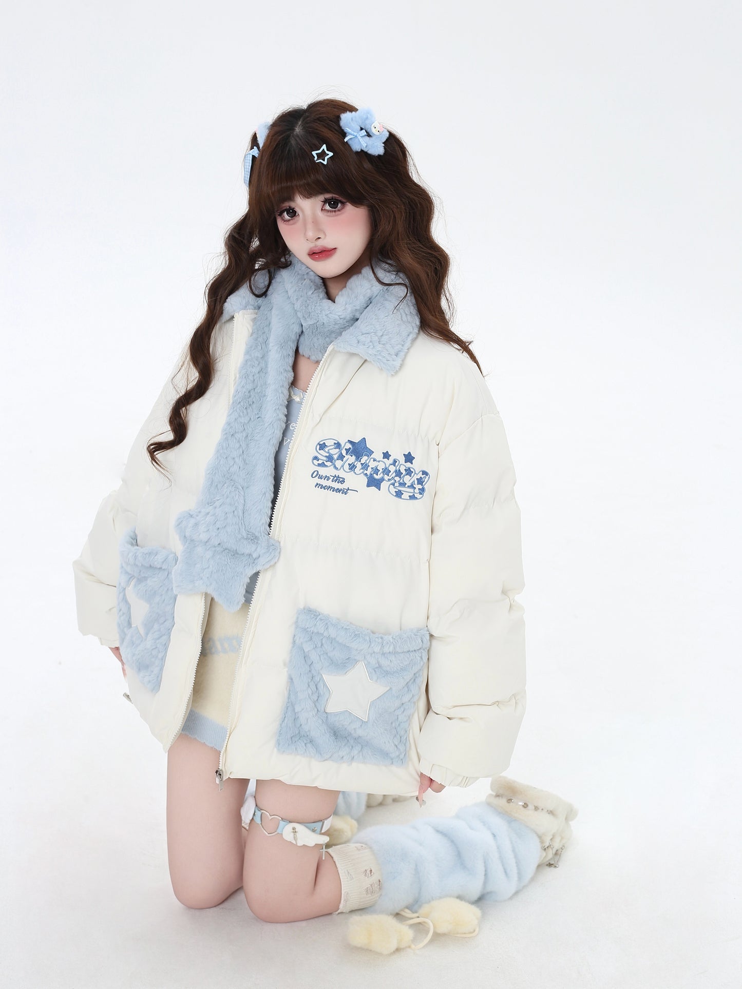 Crazy Girl Shiny Star Pink Blue Puffer Jacket & Scarf Set