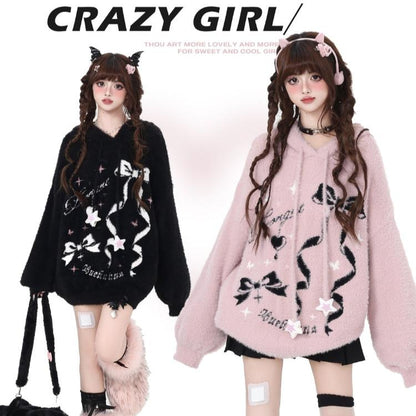 Crazy Girl Sticky Bow Black Pink Fuzzy Sweater Hoodie