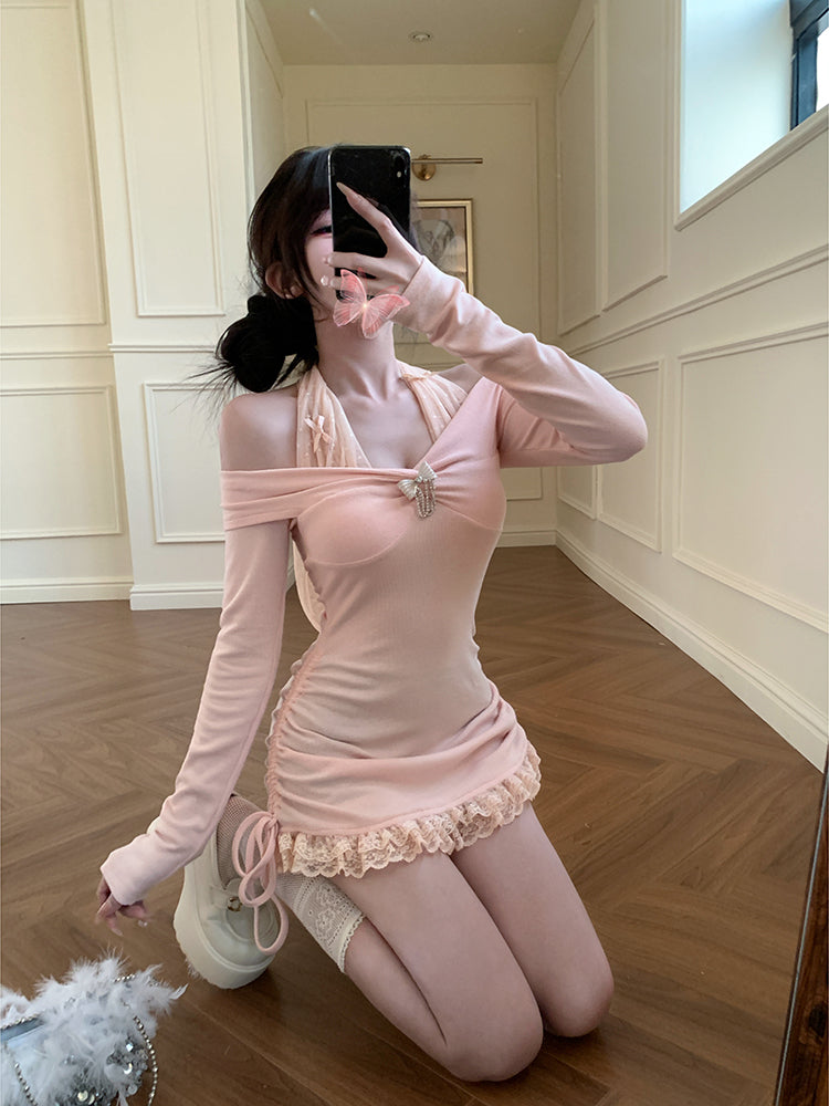 Creamy Cute Early Spring Halter Neck Pink Dress