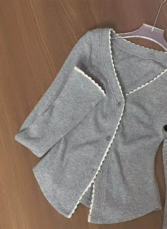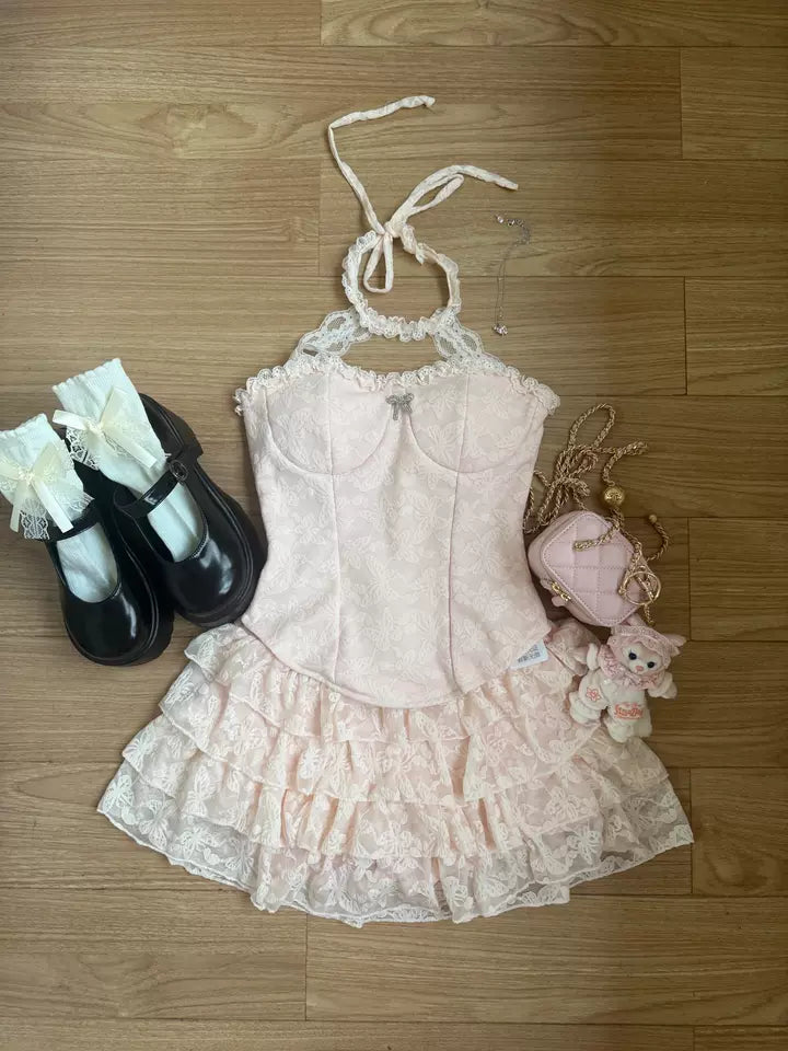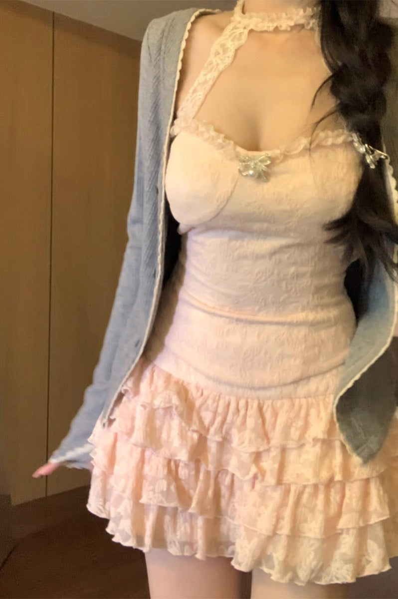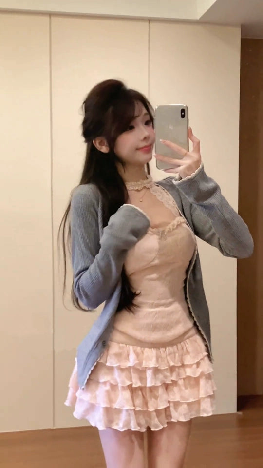 Creamy Cute Spring Drop Pink Cami & Skirt & Gray Cardigan Three Piece Set