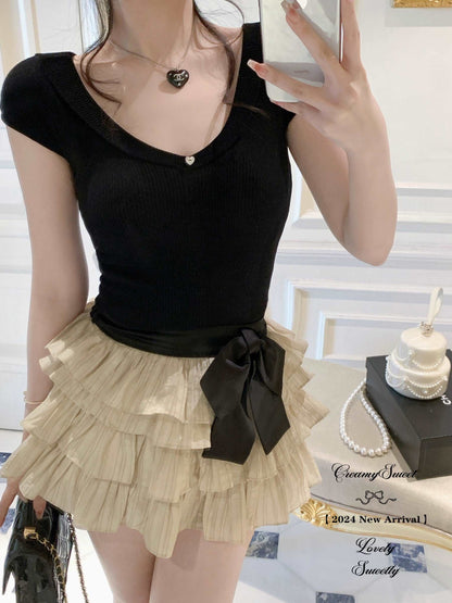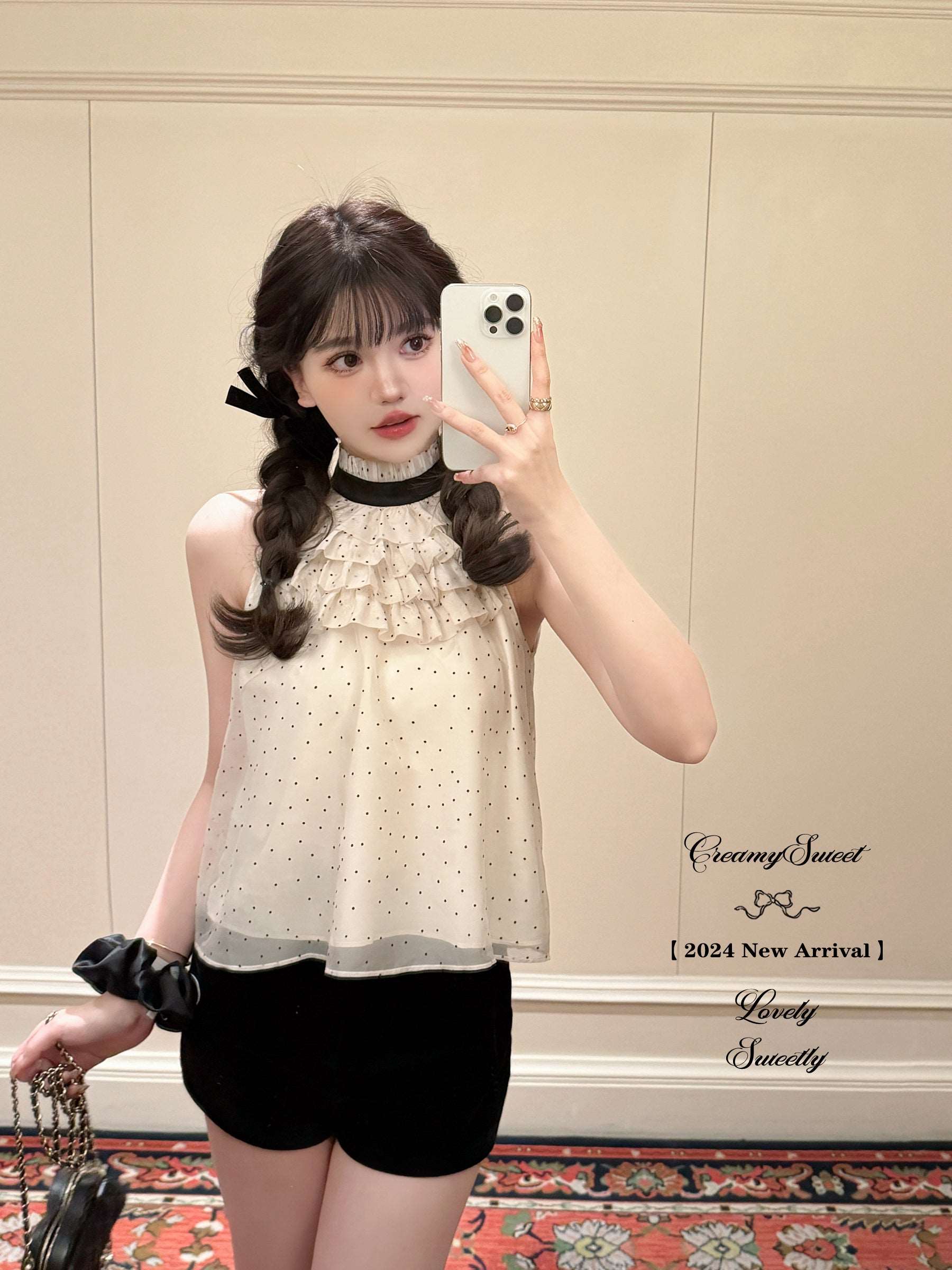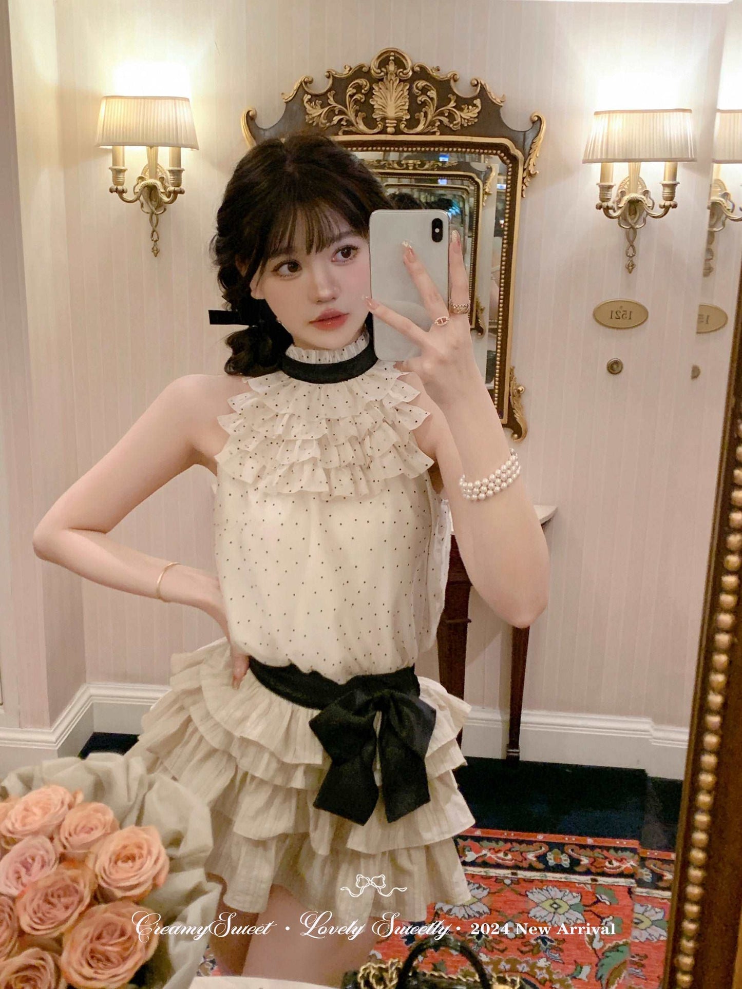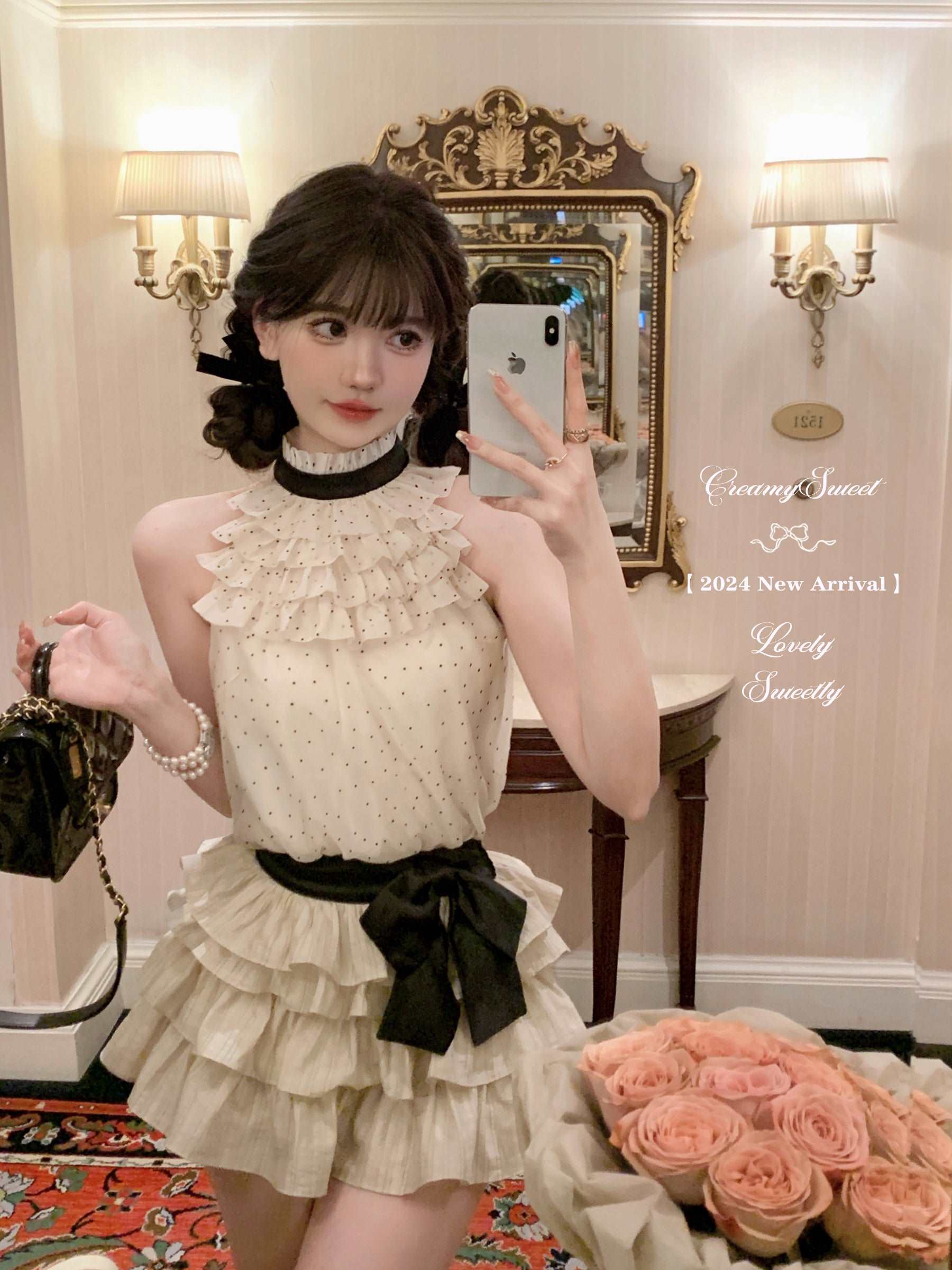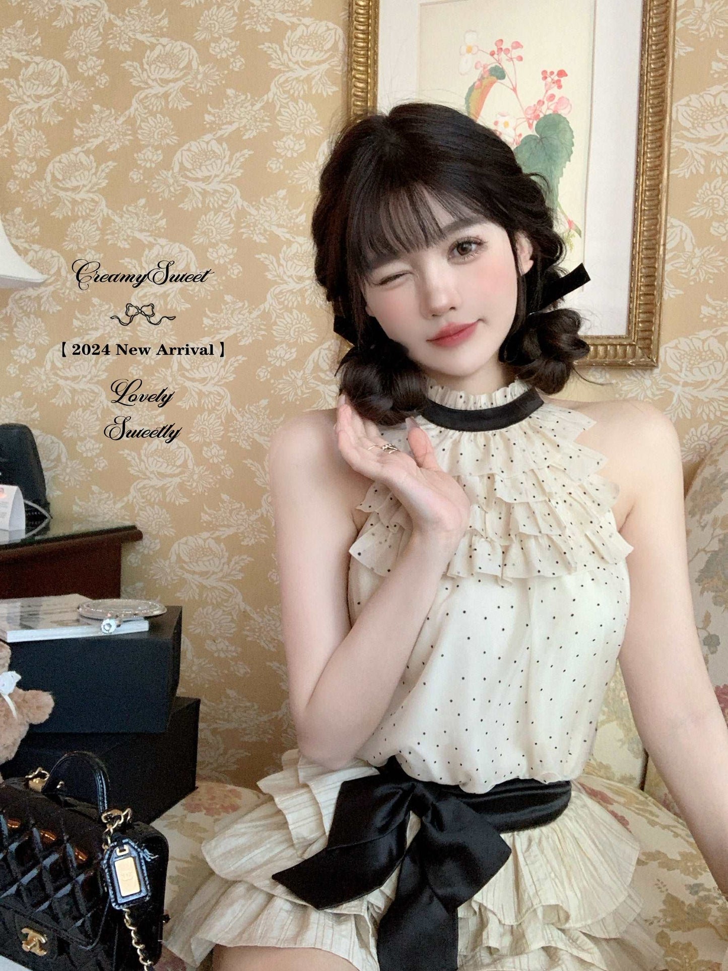 Creamy Cute Vanilla Polka Dot Chiffon Cream Black Sleeveless Top & Skirt Two Piece Set
