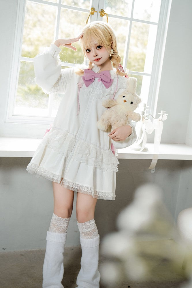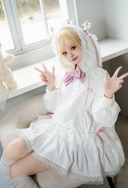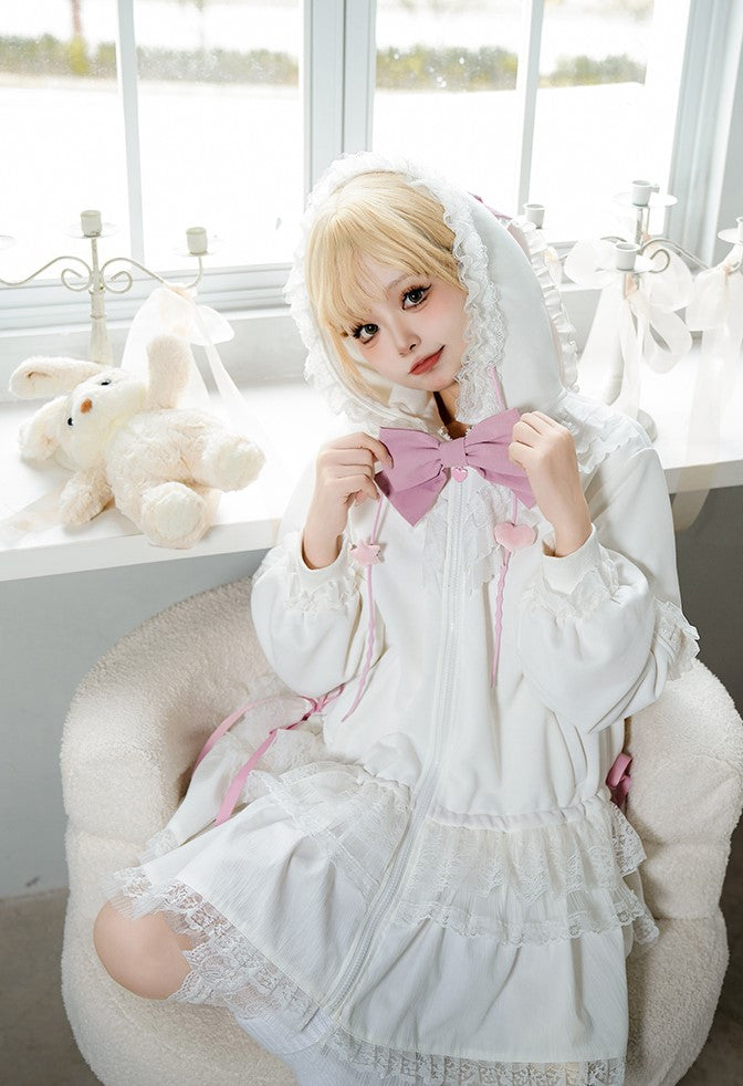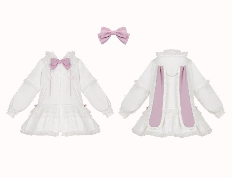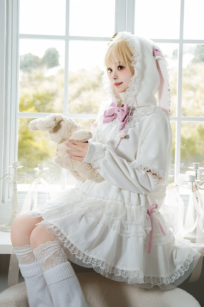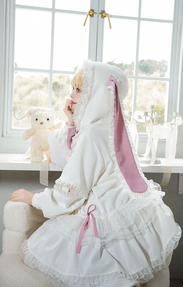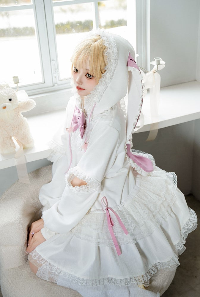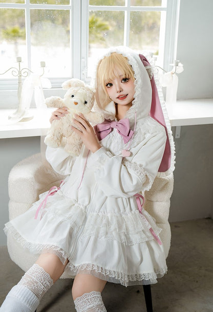 Universal Lolita Daydream Sweet Pink White Rabbit Ear Lolita Hooded Coat Dress